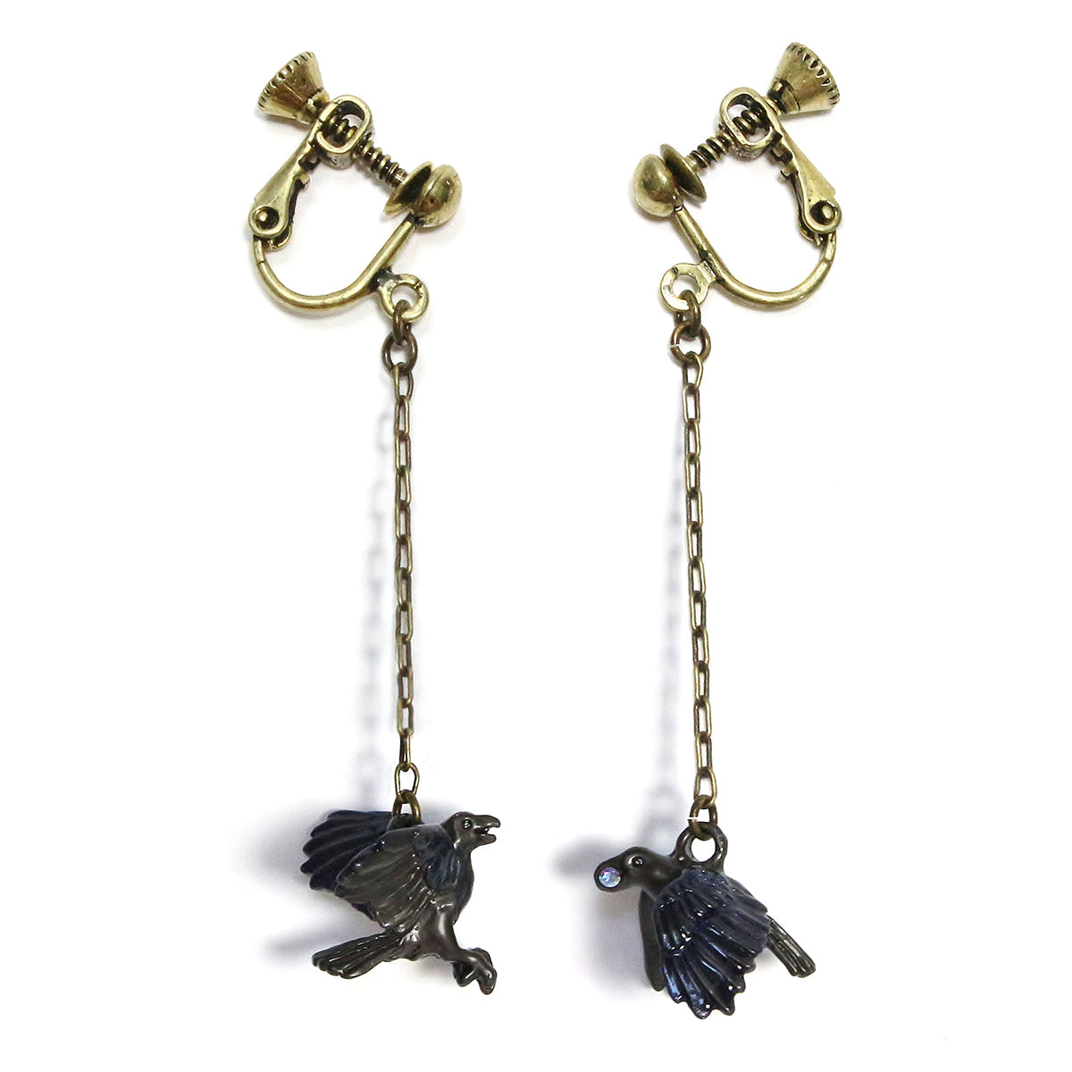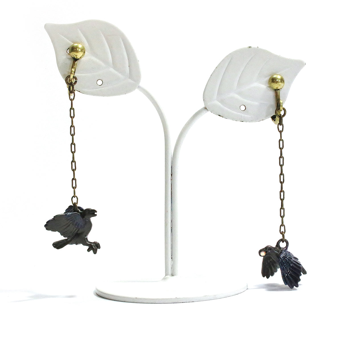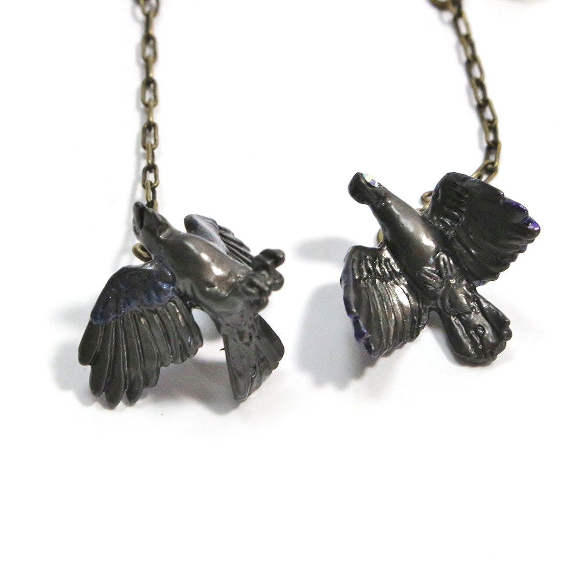 キラキラ光るものを見つけて自慢げなカラスと、「いいなぁ、それどこで見つけたの?」と羨ましそうに飛んできたカラスのイヤリング。