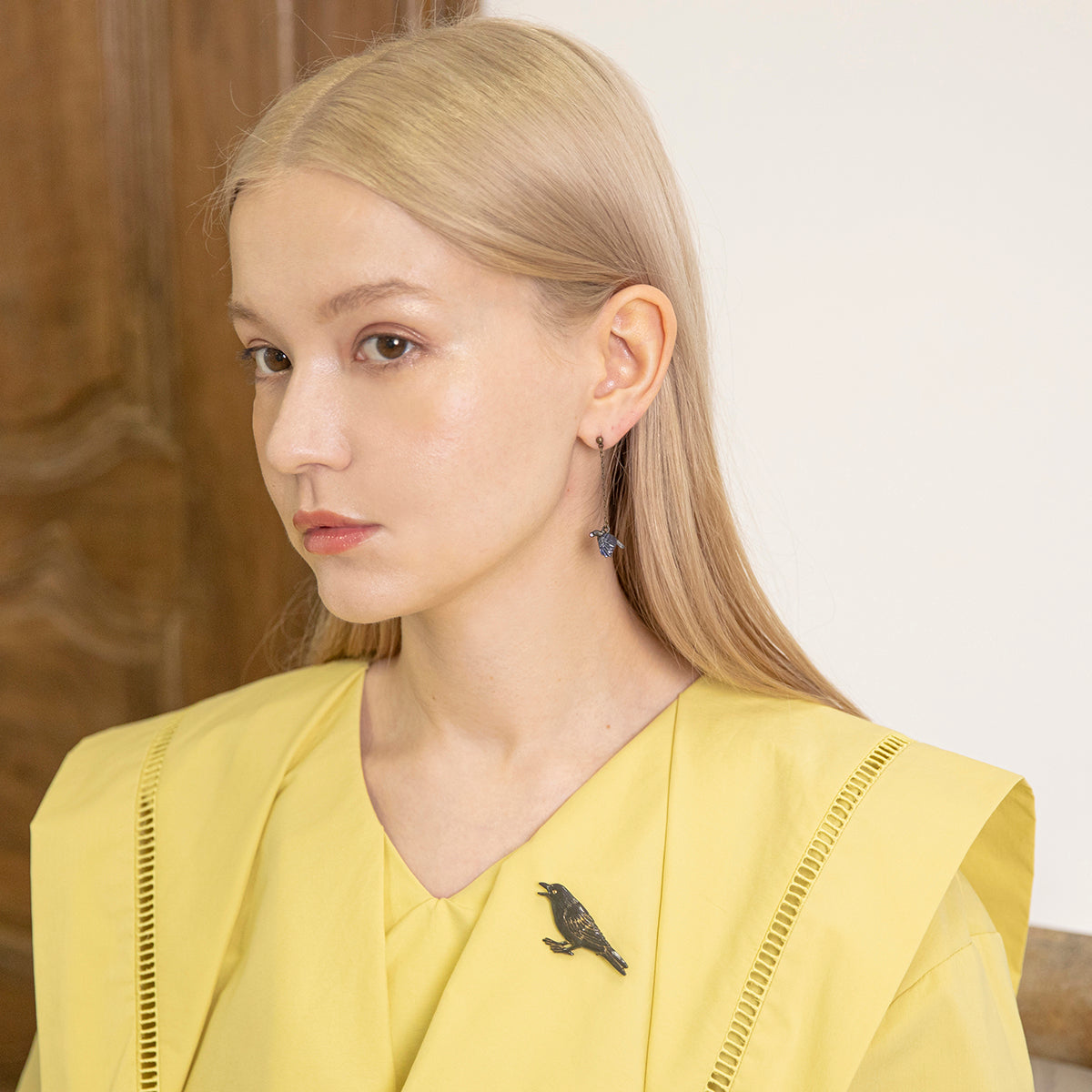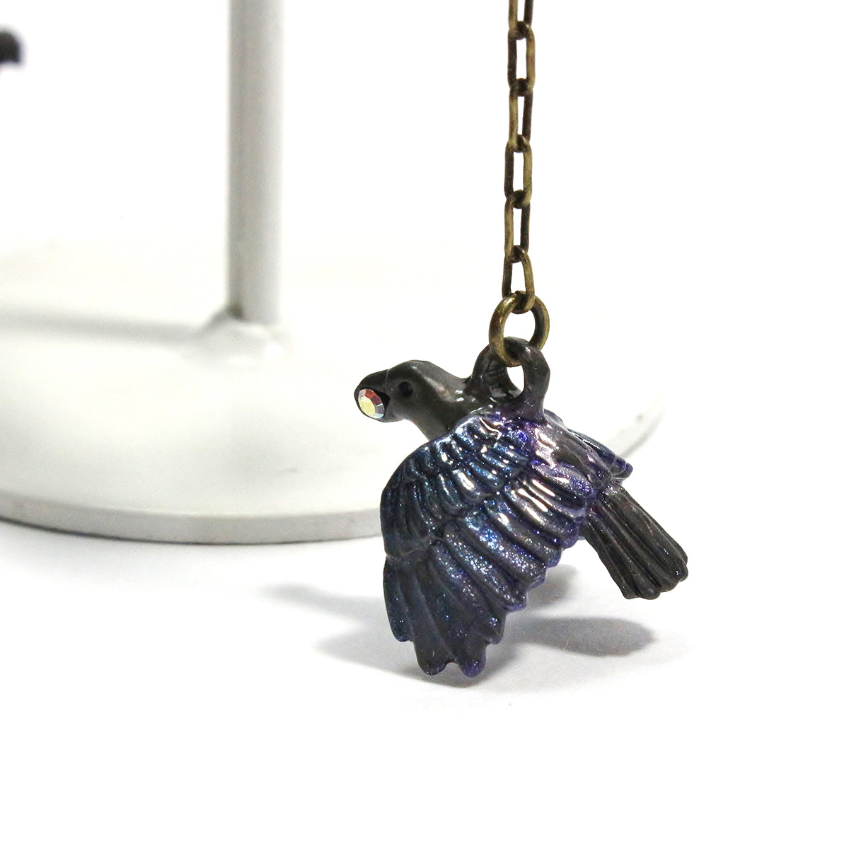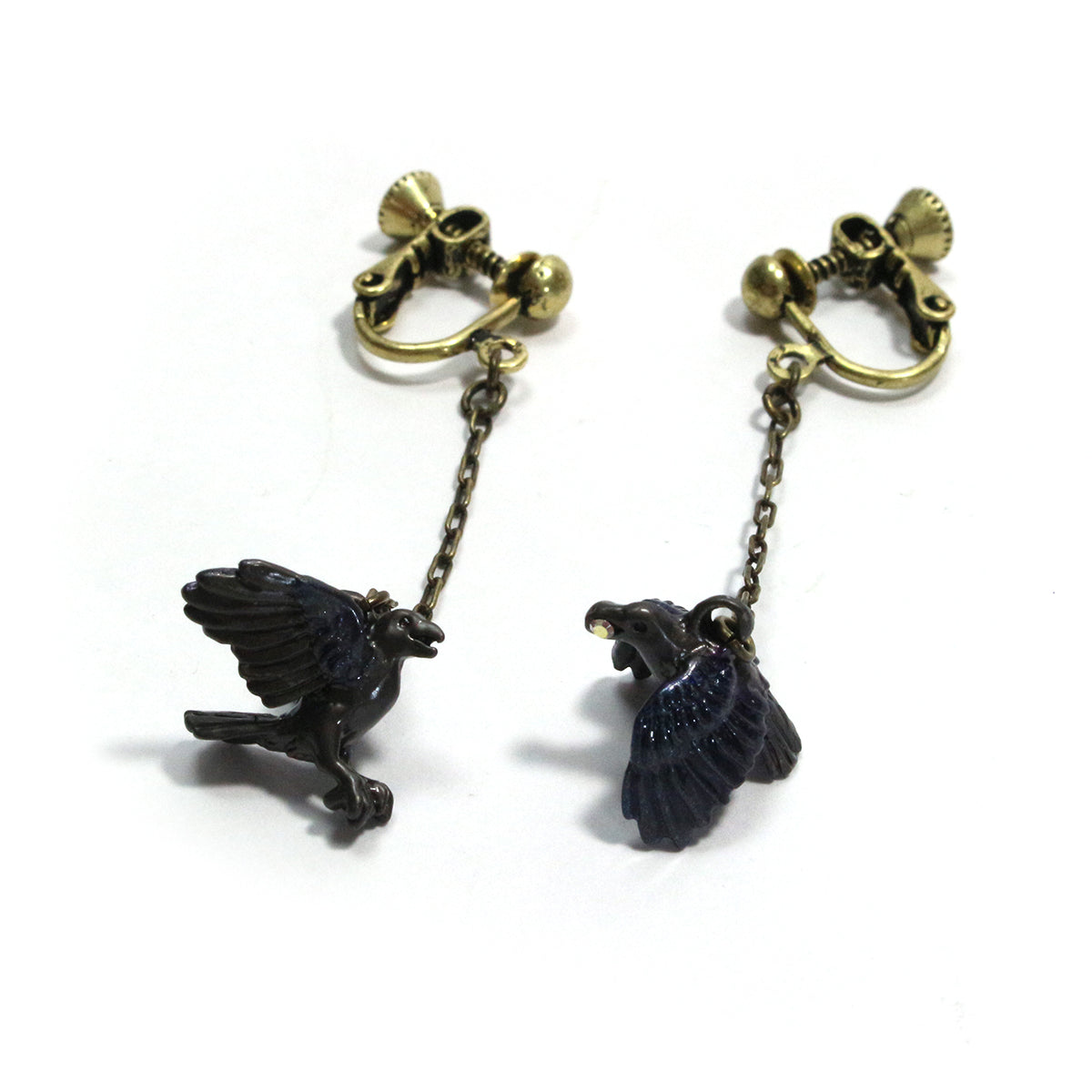 キラキラ光るものを見つけて自慢げなカラスと、「いいなぁ、それどこで見つけたの?」と羨ましそうに飛んできたカラスのイヤリング。
