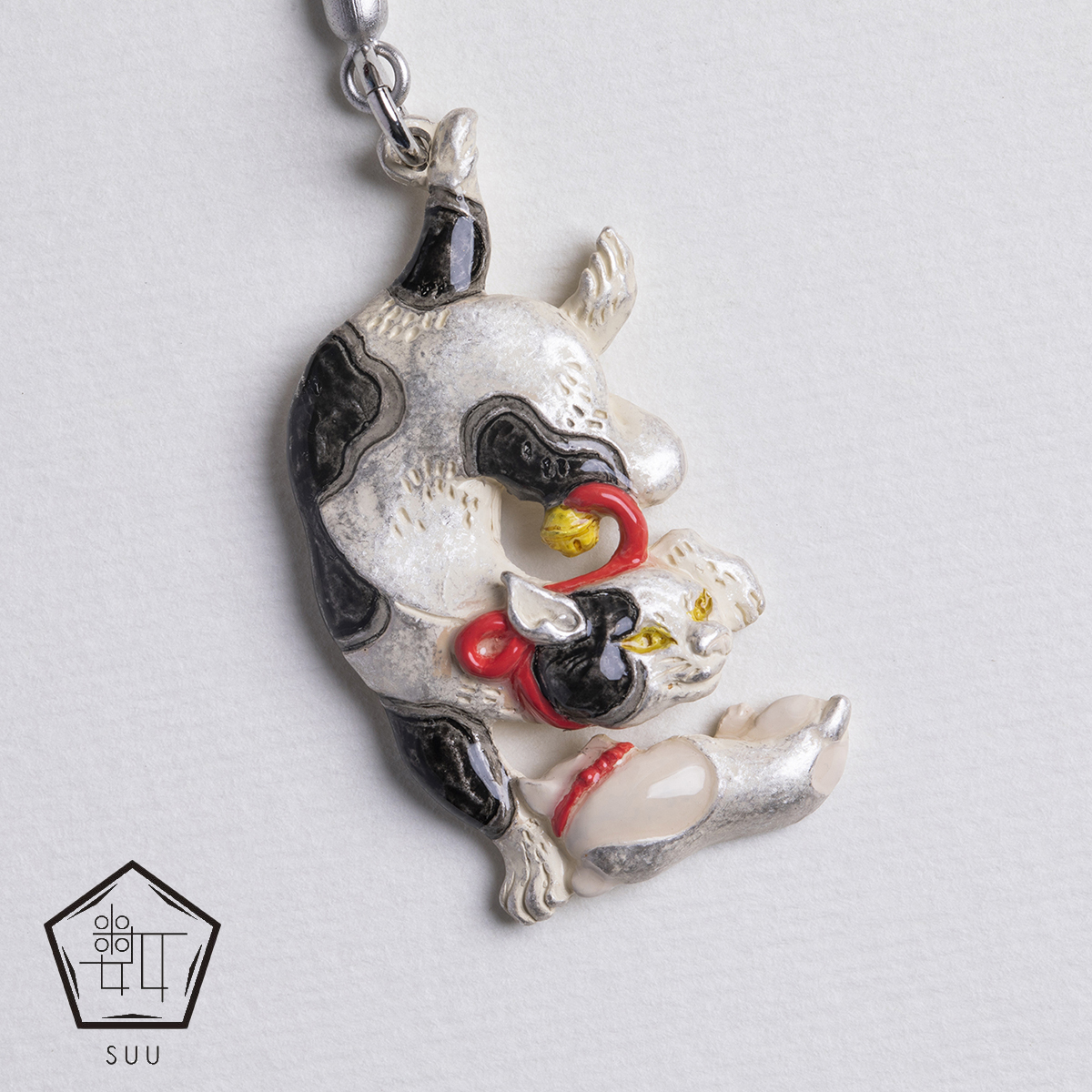 根付のチャーム部分の猫は毛並みに至るまで浮世絵を忠実に再現。