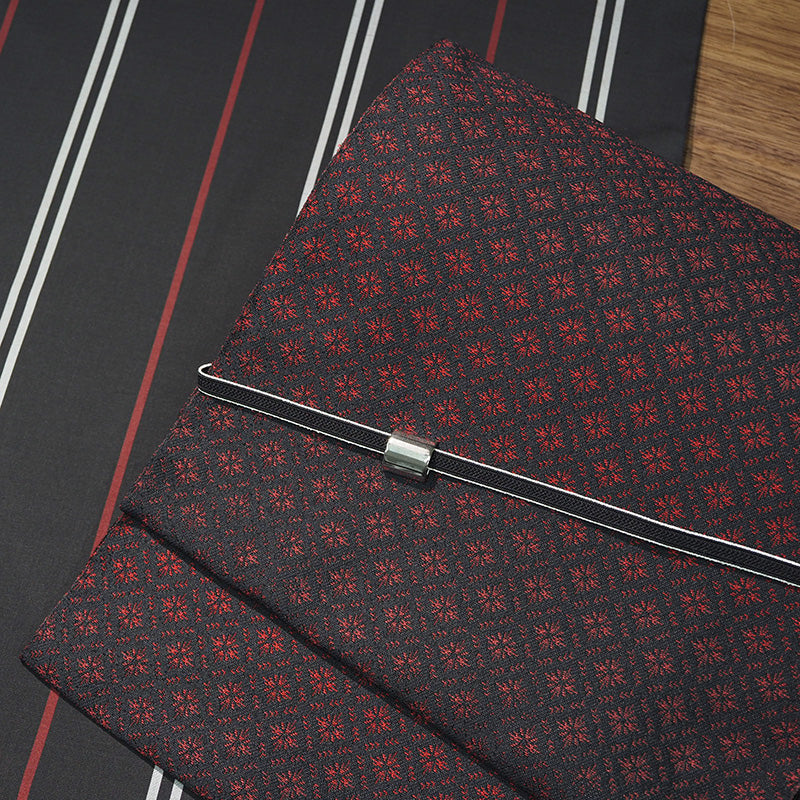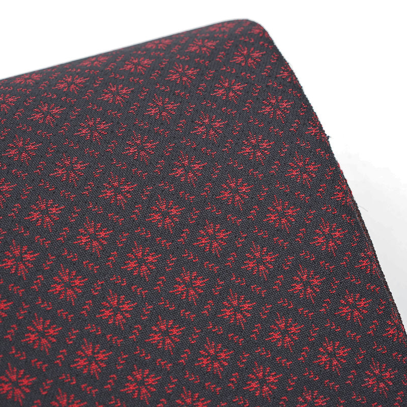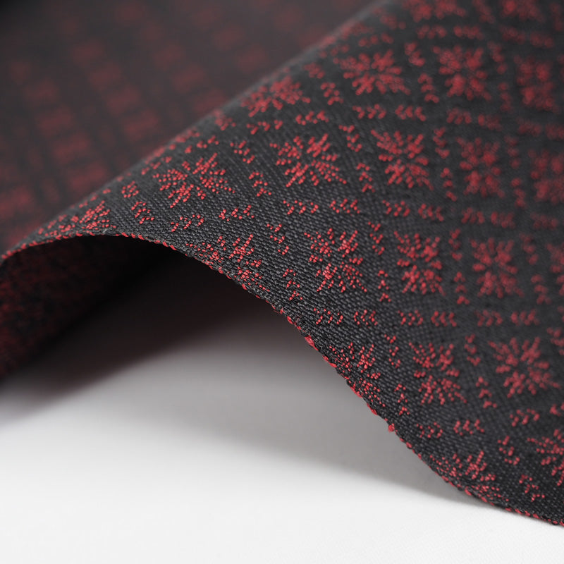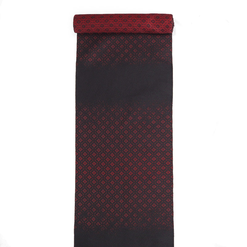 さりげない存在感と、使い心地の良さが魅力。真紅の赤を中心に、おだやかな濃淡の色糸とかすれ表現であらわされたモダンなデザイン。色彩の存在感がありつつも、お着物との調和に考慮した仕上がりです。