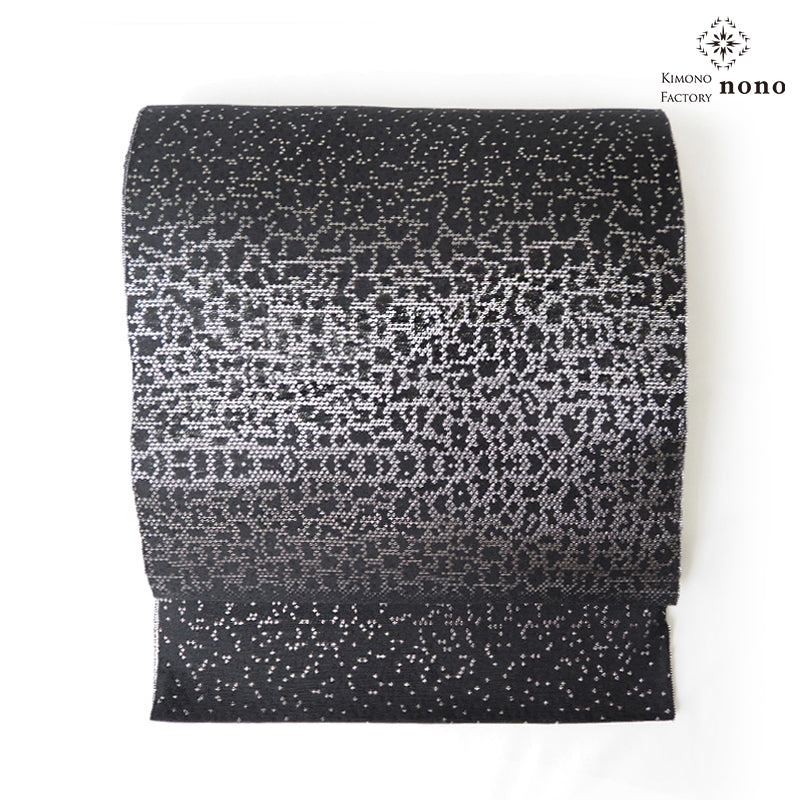 霞みの中に浮かぶ、モダンな抽象柄。光沢のある銀糸をふんだんに用いて表現されたまるでクラックグラスのようなデザイン。存在感がありつつも、合わせるお着物を選ばないシックさが魅力です。