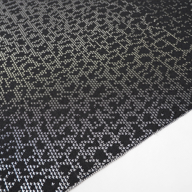 スパイスを効かせたインパクトのあるデザインが魅力の【Crack】。光沢のある銀箔糸と黒箔糸で織りあげられた華やかで個性的な配色は、他にはない特別な存在感を放ちます。伝統的な枡屋儀兵衛の本場大島紬の図案を、nonoが丁寧に帯へとアレンジし、現代的なコーディネートにも寄り添うデザインに仕上げました。