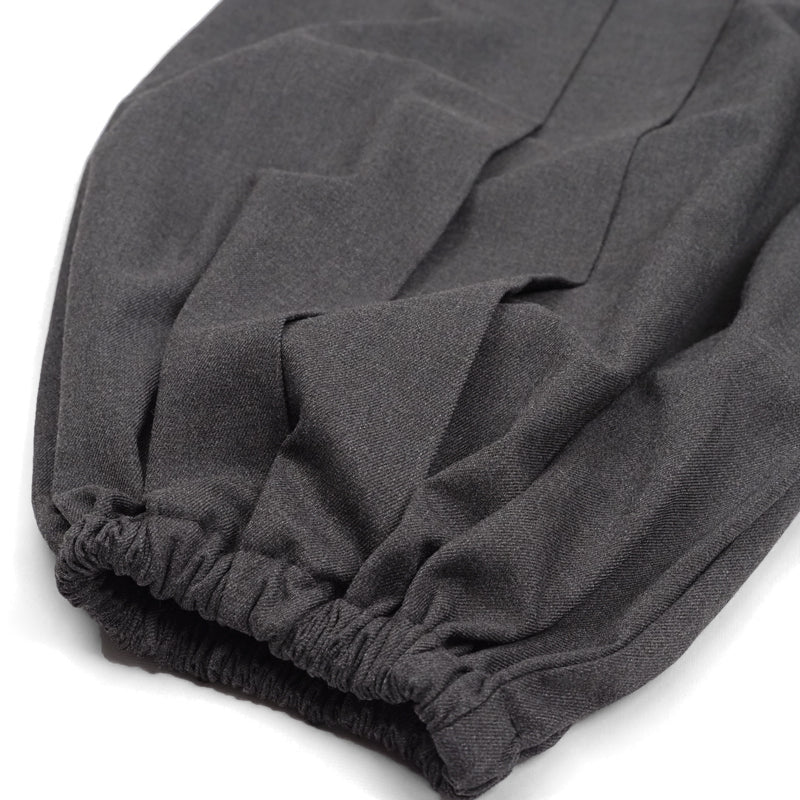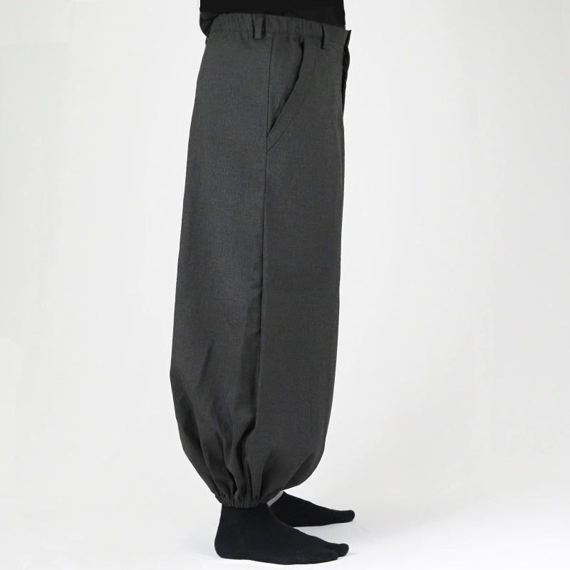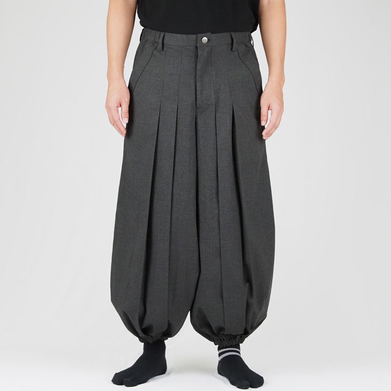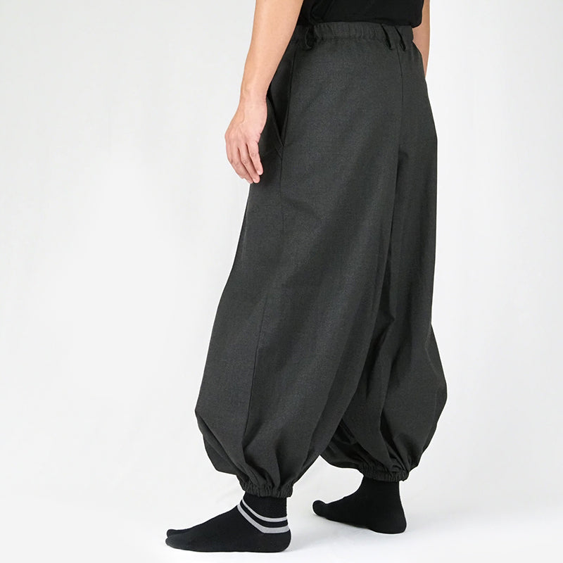 古き良き「野袴(のばかま)」をベースに、現代のライフスタイルに合わせて再構築したモード感漂うデザインパンツです。特徴的なゆったりとした腰回りと裾の絞りを活かしつつ、すっきりとしたタックラインで上品な印象に仕上げました。