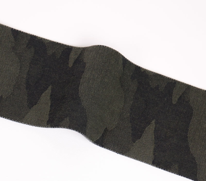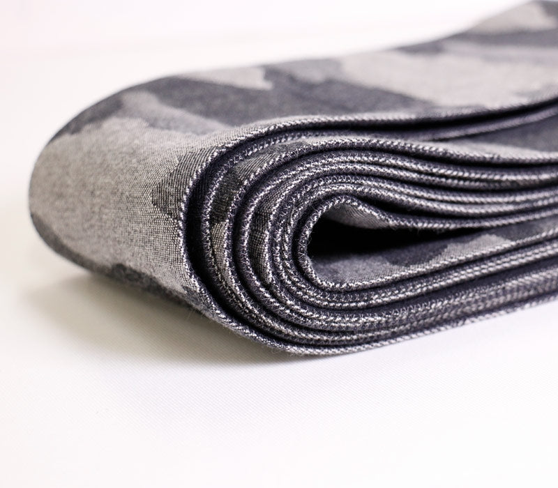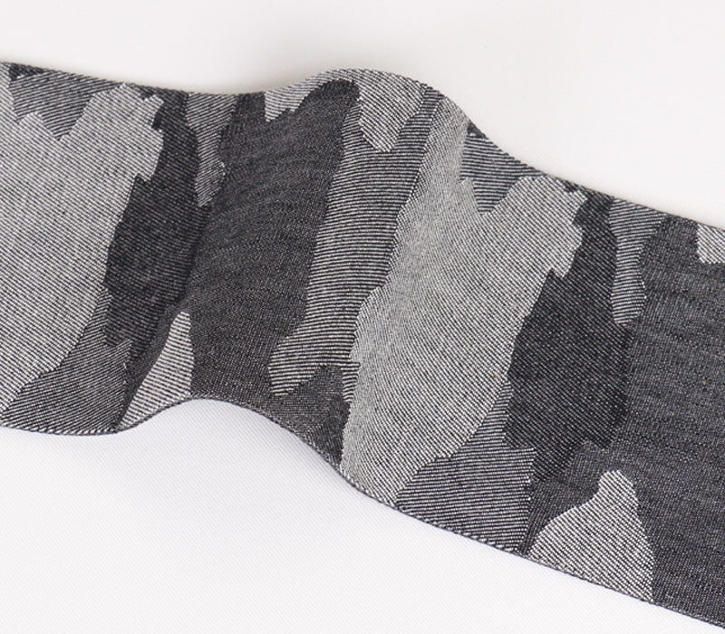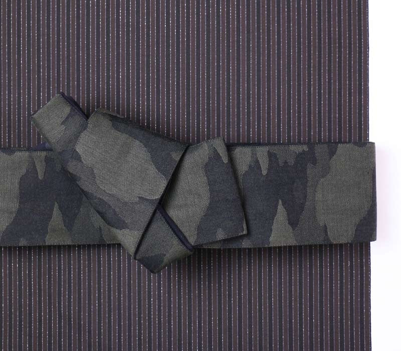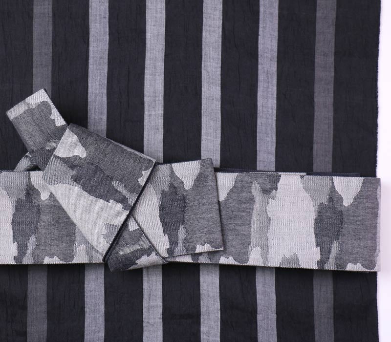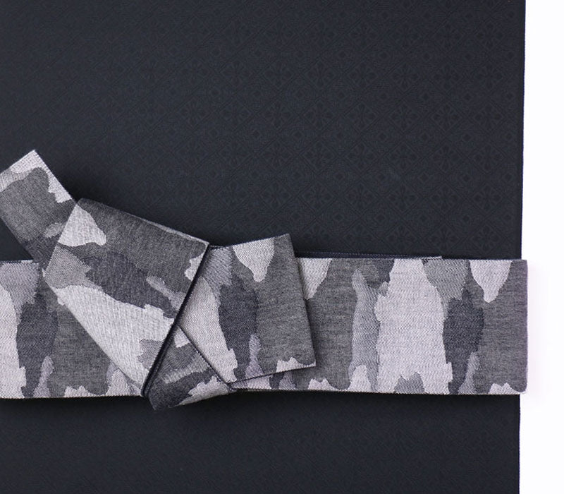 ざっくりとしたジャガード織りの帯地。迷彩柄やレオパード柄を組み合わせたアバンギャルドなデザイン。博多帯のような「カチッと」したイメージ・結び心地とは異なり、柔らかめの素材感と気軽さが特徴の帯。とびきり個性を楽しみたい、というお方へお勧めの商品です。