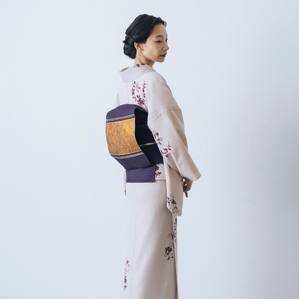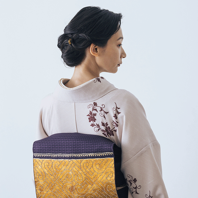 ゆらぎのある三桝を背景に浮かび上がるのは、伸びやかな筆運びが美しい牡丹唐草。帯合わせ次第で粋な着こなしにも、よそゆきな着こなしにもなる、着用シーンの幅広さが魅力です。