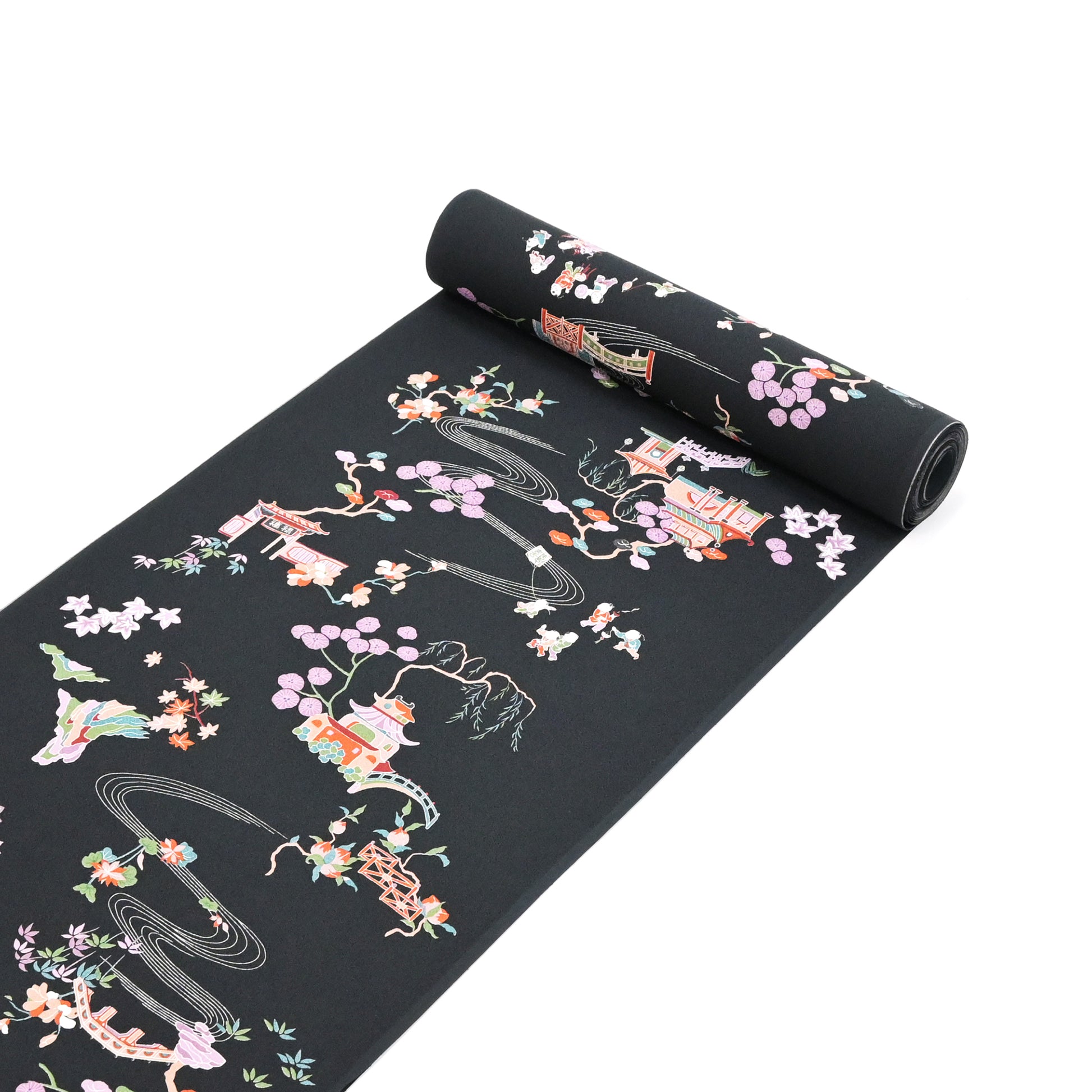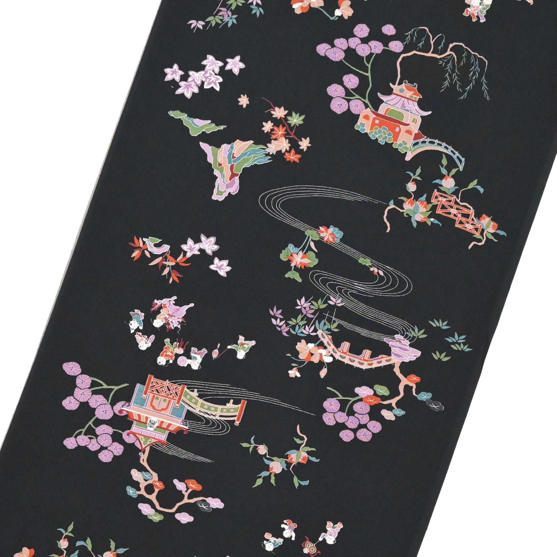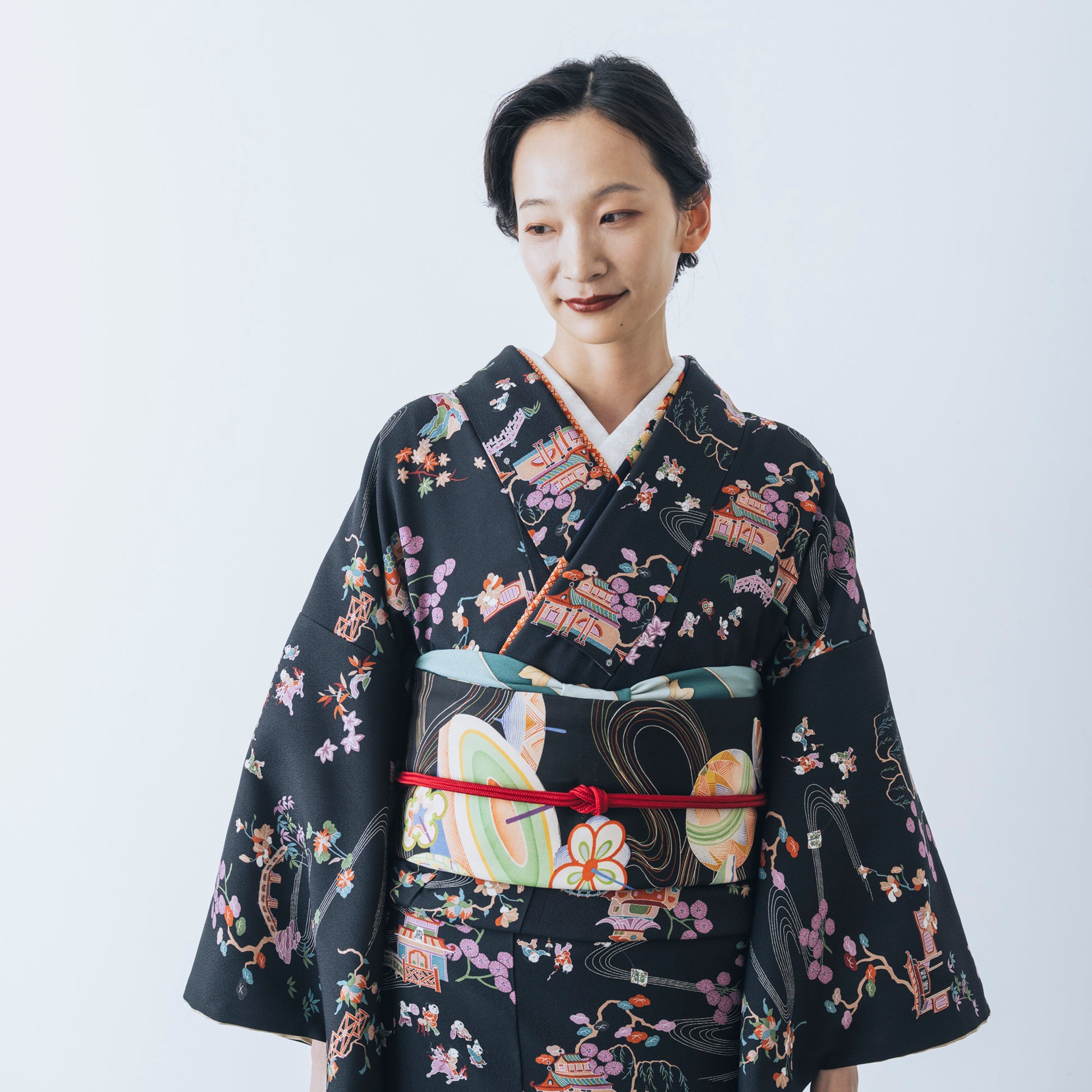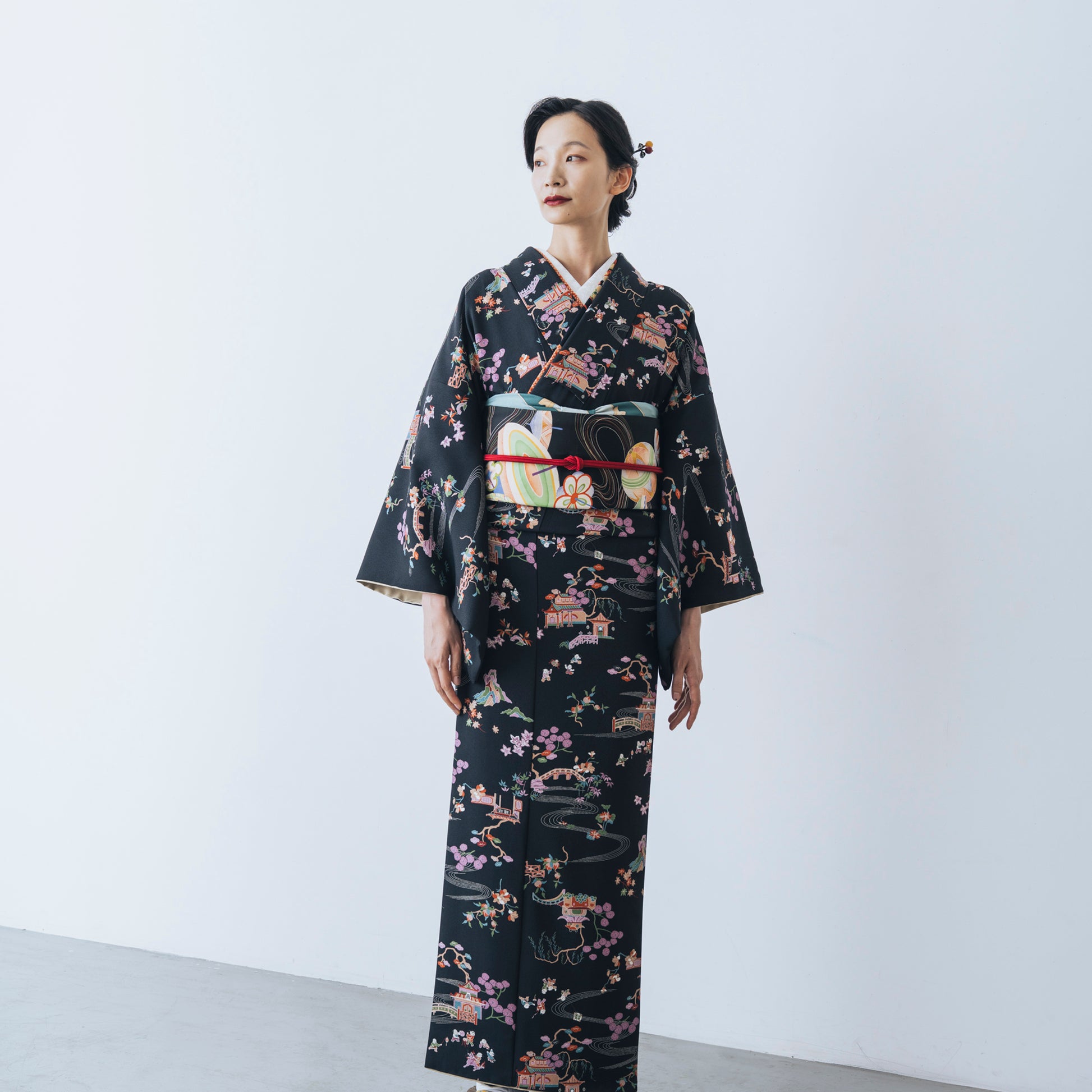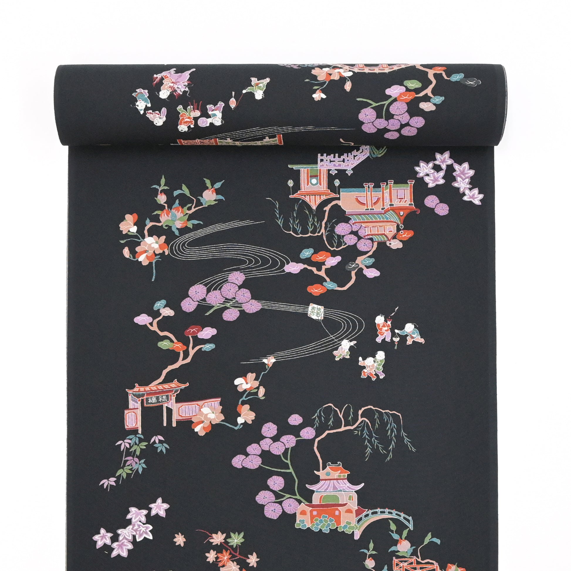 昔々の中国を思い描き、唐子たちが鳴り物や灯篭を手に楽しそうに遊び回る景色を描いてもらいました。色ごとにガラリと印象が変わりますが、どれもニュアンスのある多色使いで意外な帯が好相性を見せてくれたりとコーディネートも楽しい一枚です。