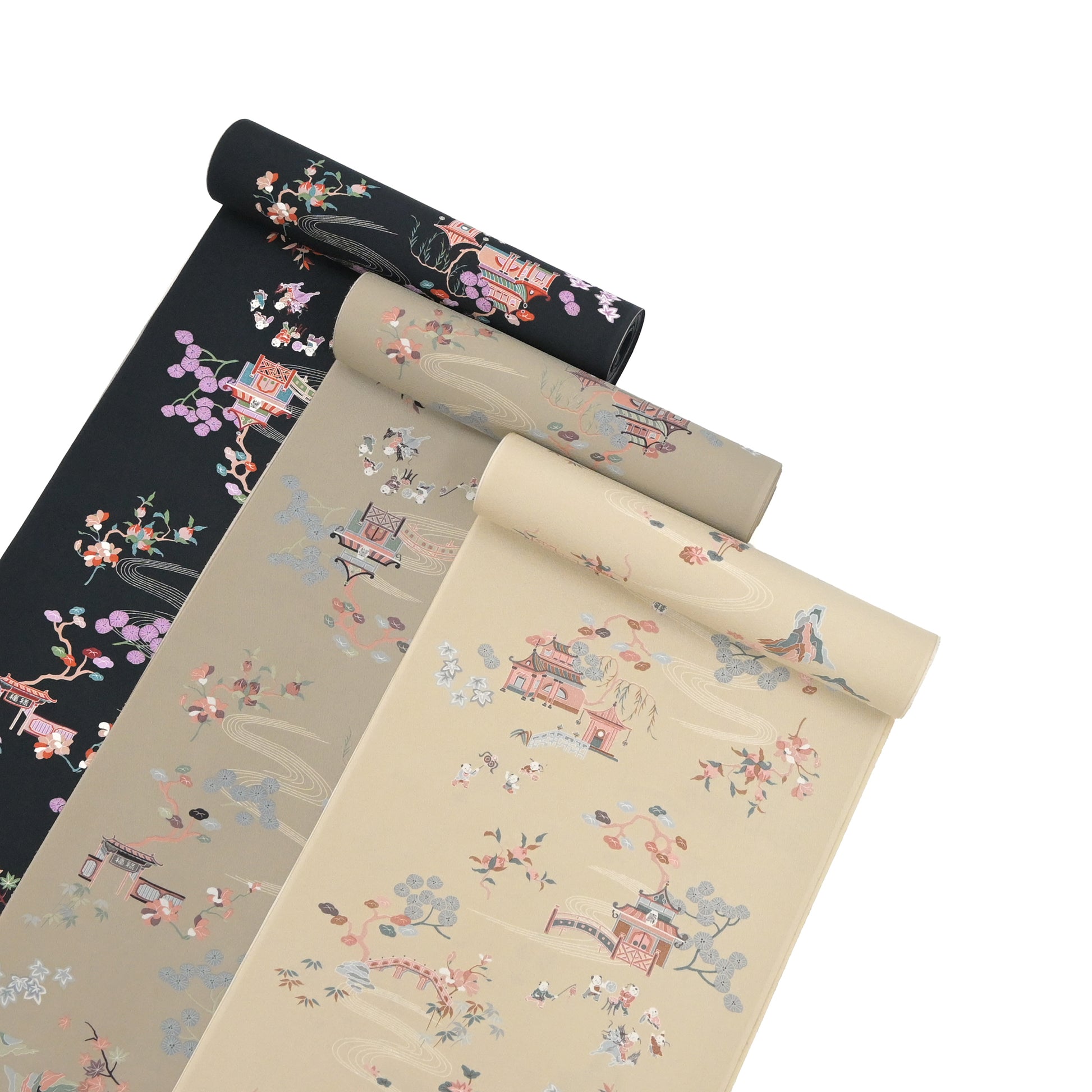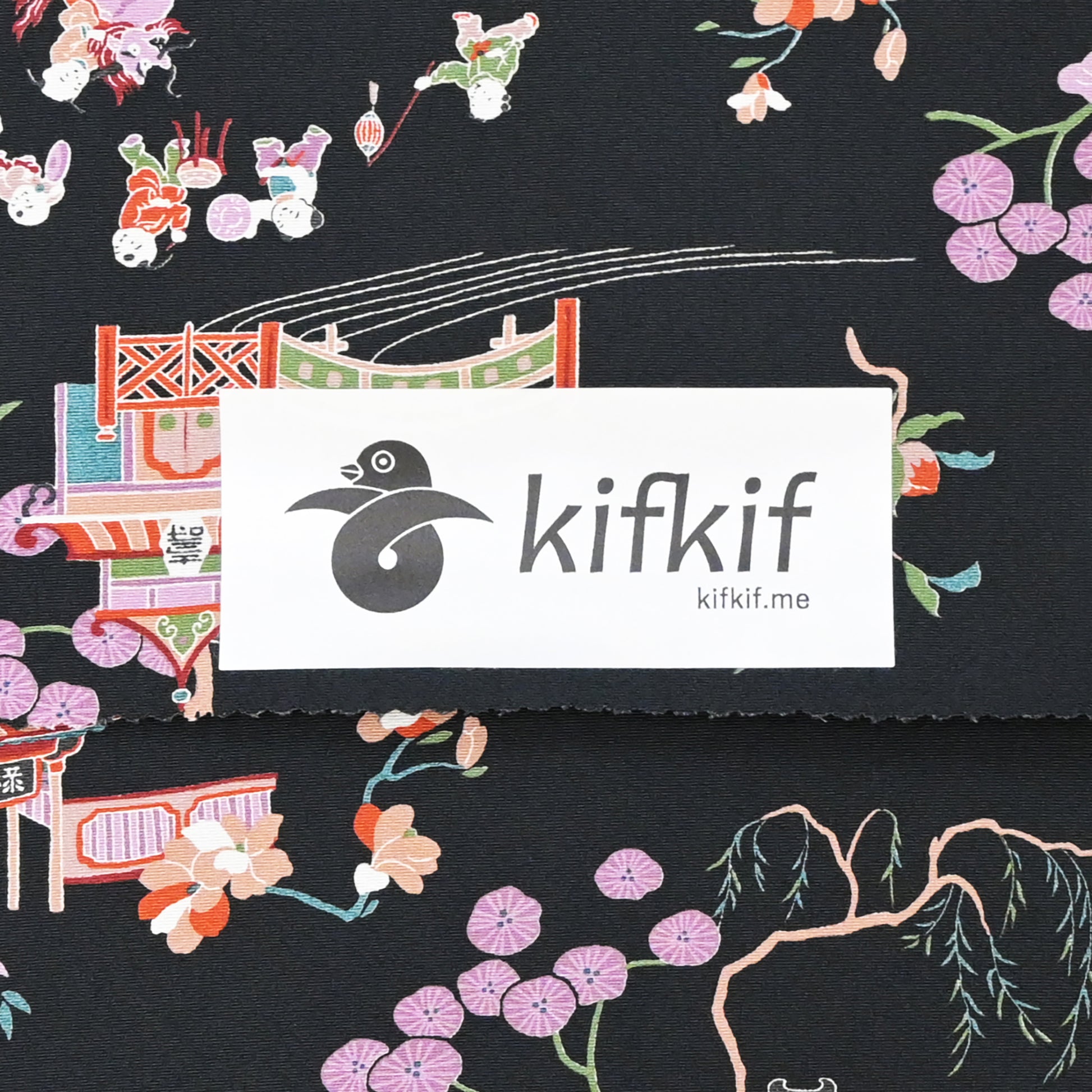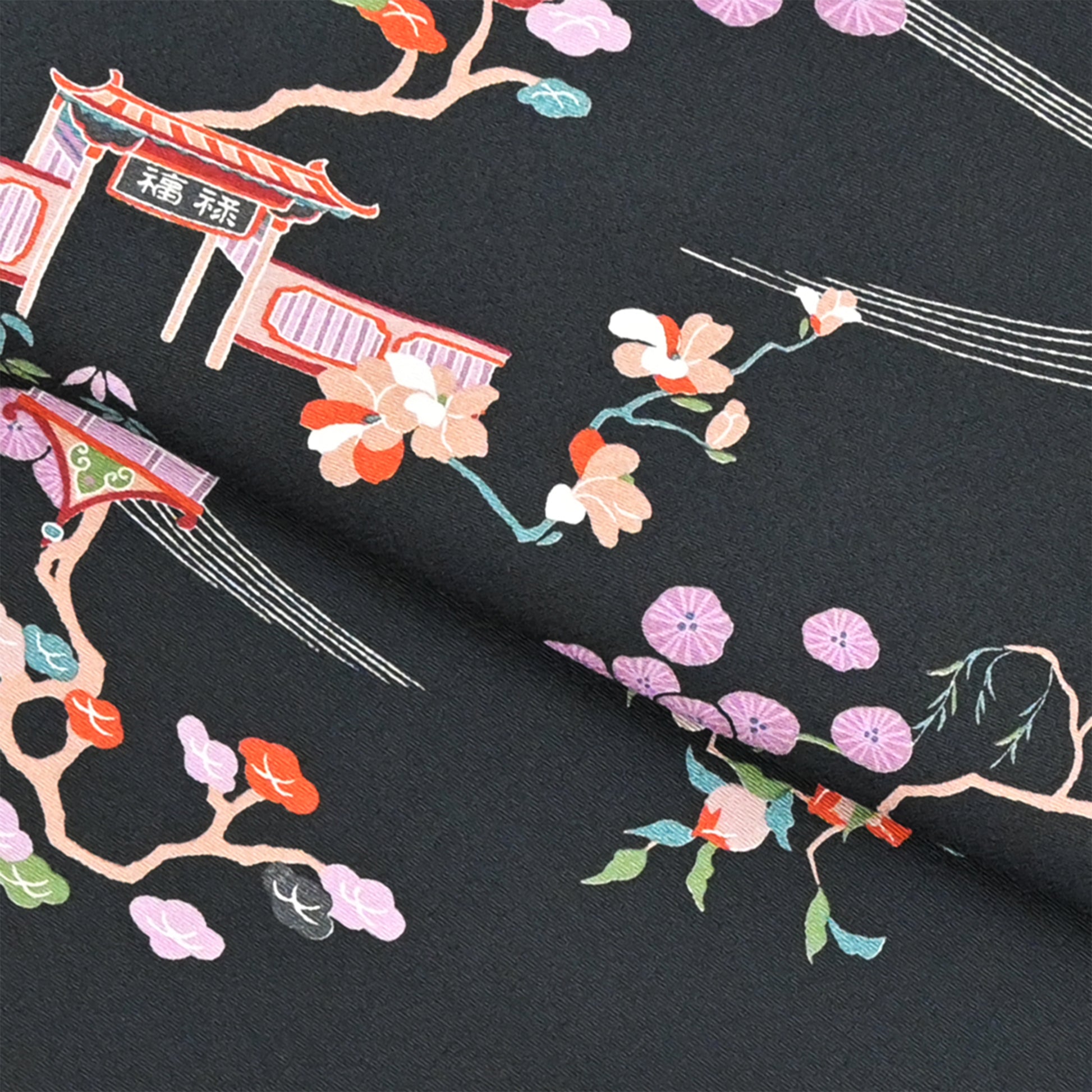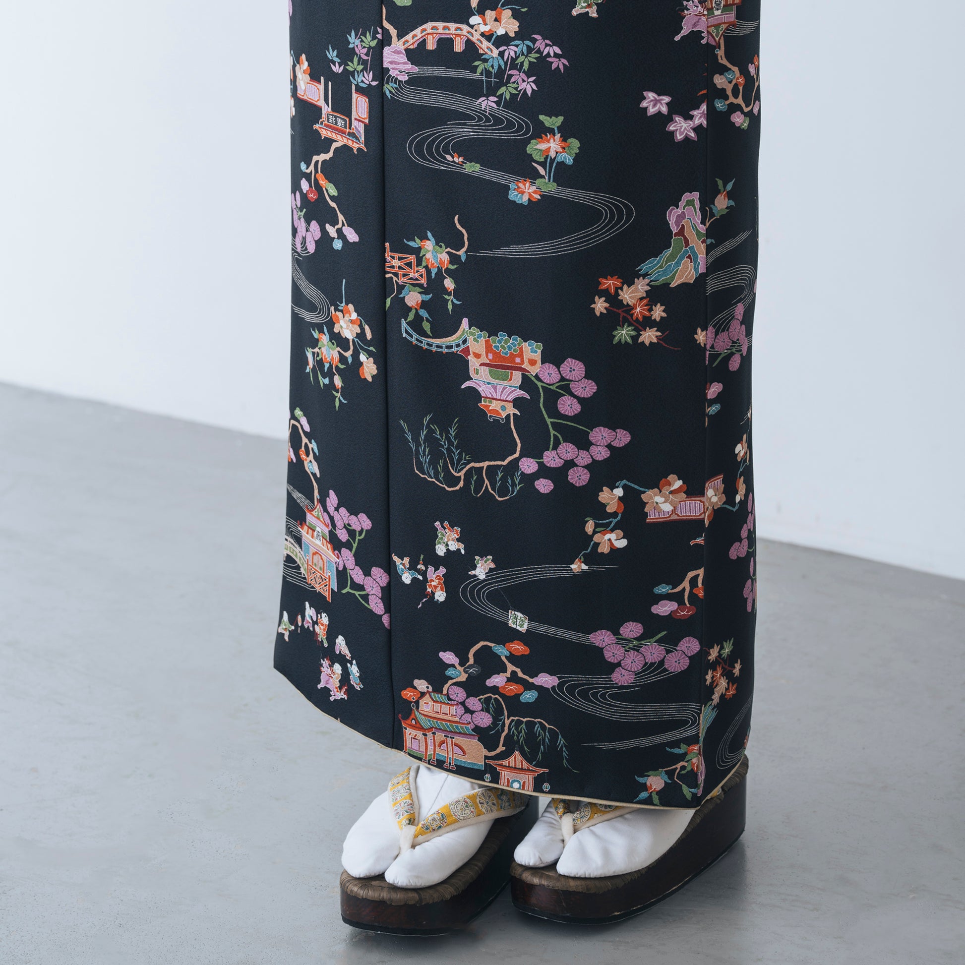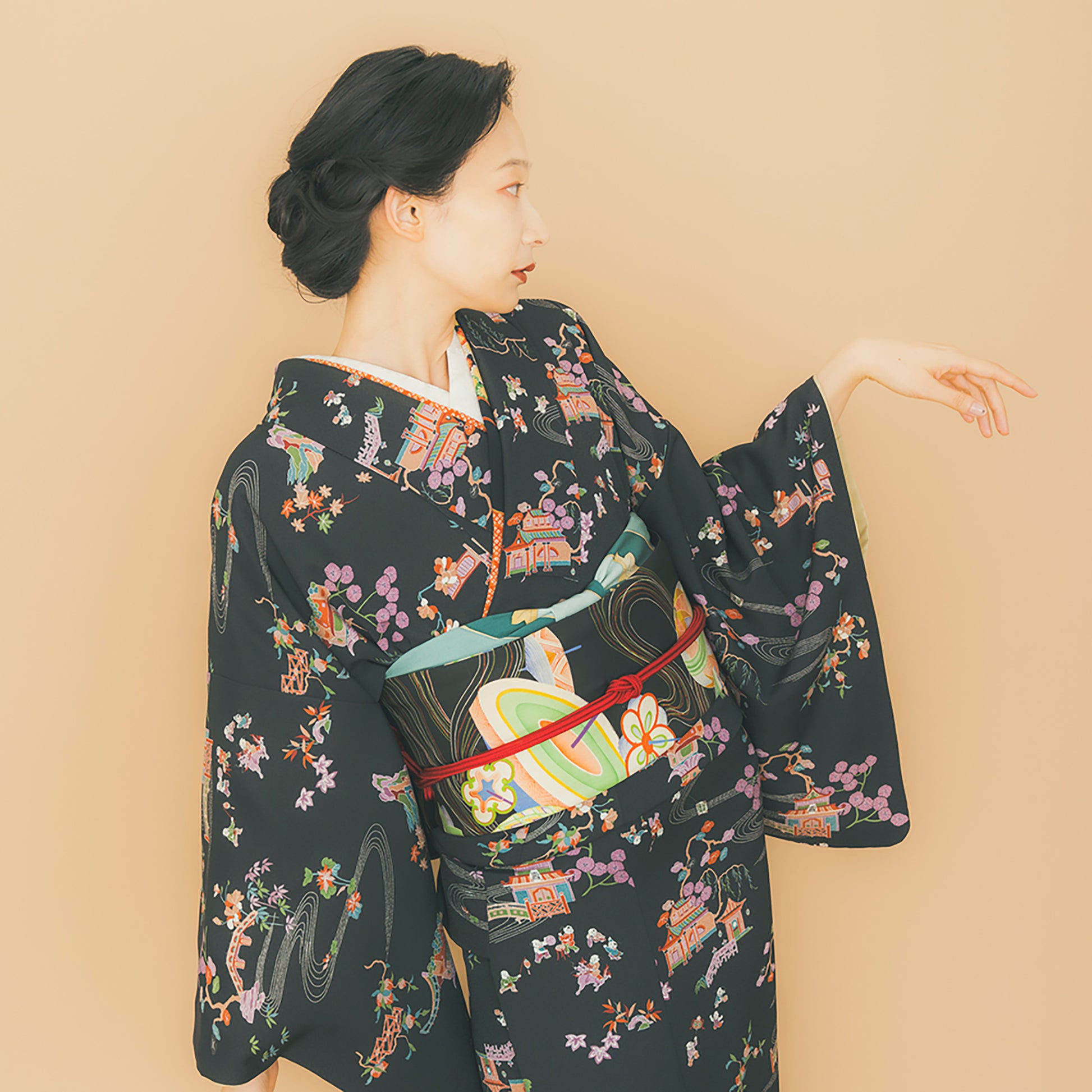 昔々の中国を思い描き、唐子たちが鳴り物や灯篭を手に楽しそうに遊び回る景色を描いてもらいました。色ごとにガラリと印象が変わりますが、どれもニュアンスのある多色使いで意外な帯が好相性を見せてくれたりとコーディネートも楽しい一枚です。