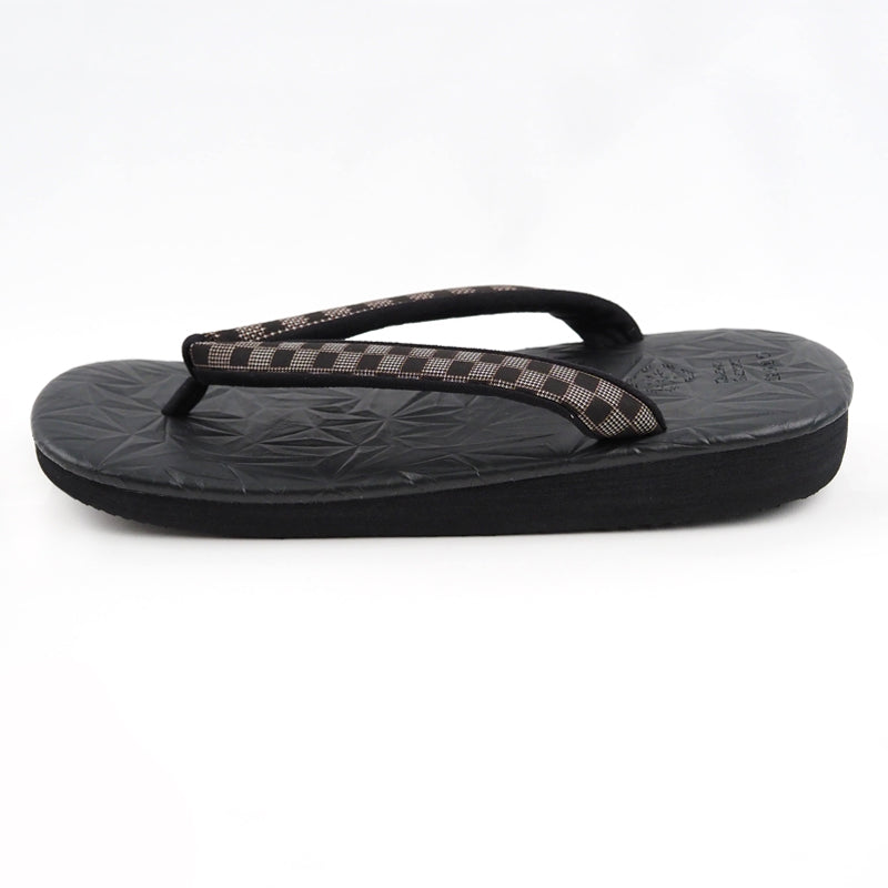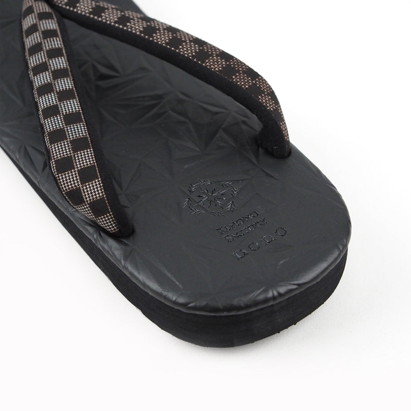 鼻緒を額縁のように仕立てることで足が痛くなりにくく、本場大島紬の生地を傷めず長く楽しむことができる仕様に。シックに足元を引き締めるお洒落なnonoのカフェ草履をぜひお楽しみください。