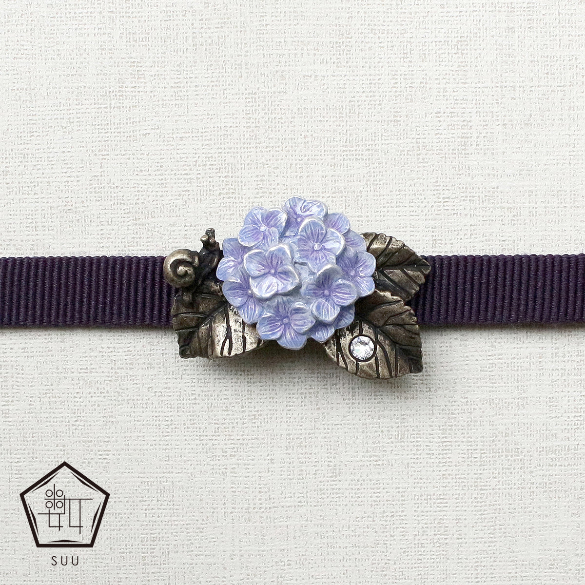 満開の紫陽花の帯留め。(葉っぱの上にはカタツムリが…)