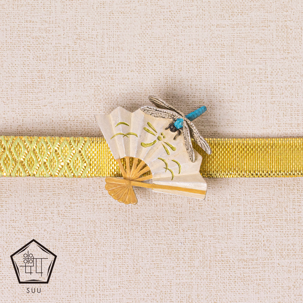 扇を的に向かい投げ競う日本の伝統的な遊びがモチーフになっており、遊びに興じていたところ扇の柄に惹かれてシオカラトンボが飛んできた様子をデザインしています。