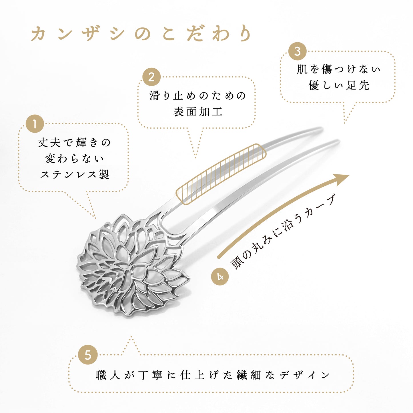 三代目板金屋 KANZASHI「花と四季」シリーズは花鳥風月の美しさを繊細なデザインで表現。和装洋装問わず、あなたの個性を引き立て、どんなシーンでも自信を持って装えます。ありふれたアクセサリーでは満足できない方にこそ選んでいただきたい、唯一無二の一品。ぜひ、この新しい「KANZASHI」であなたの美しさを格上げしてください。