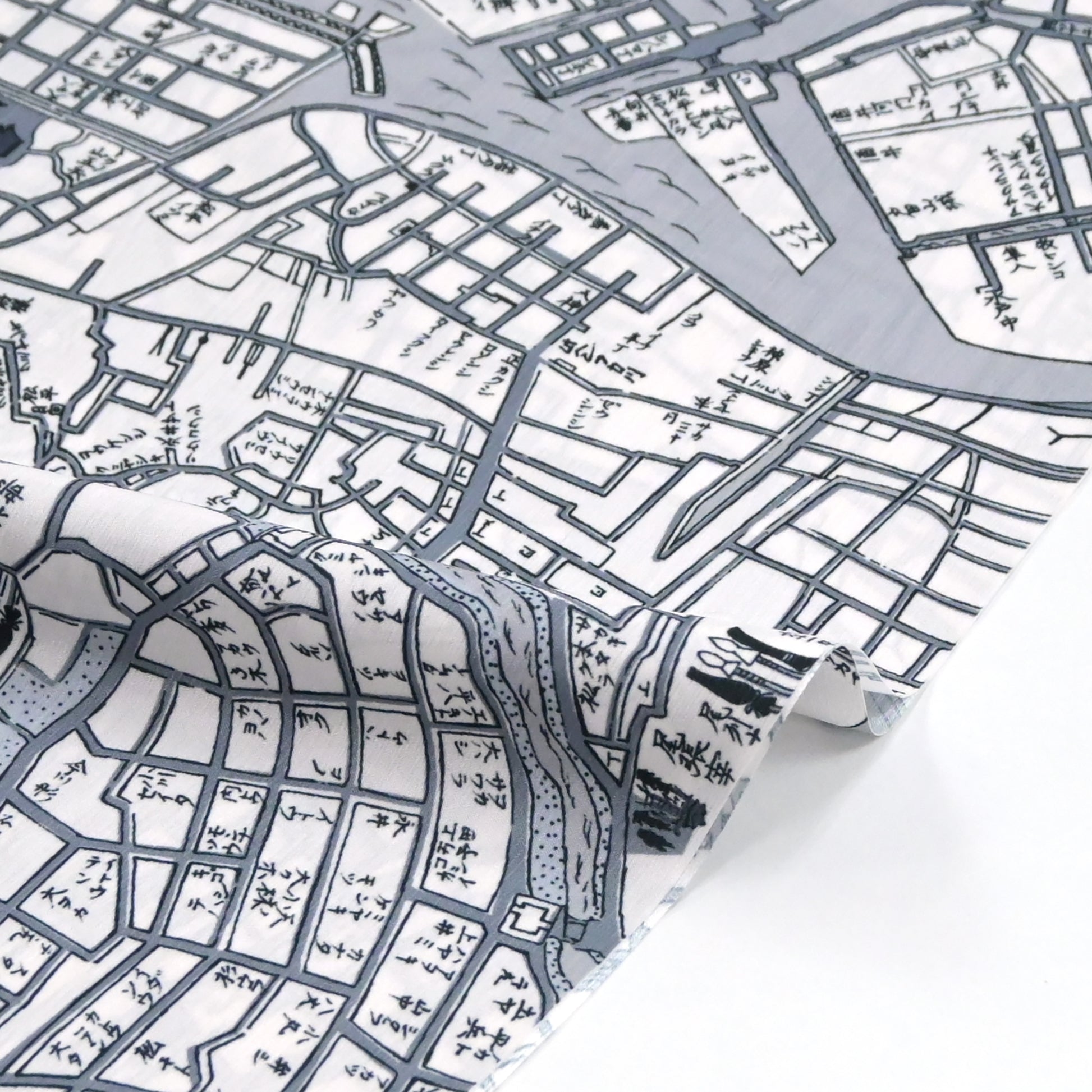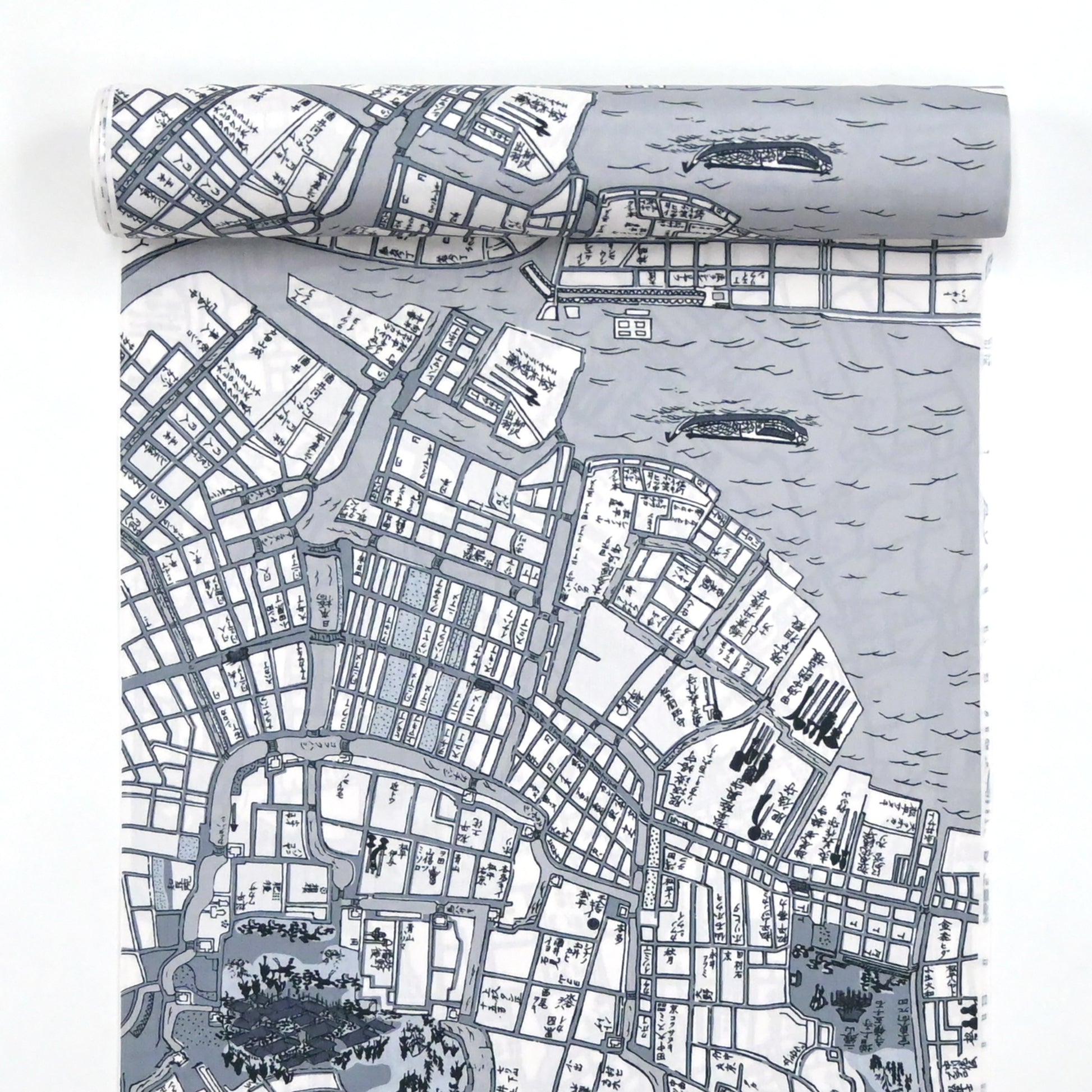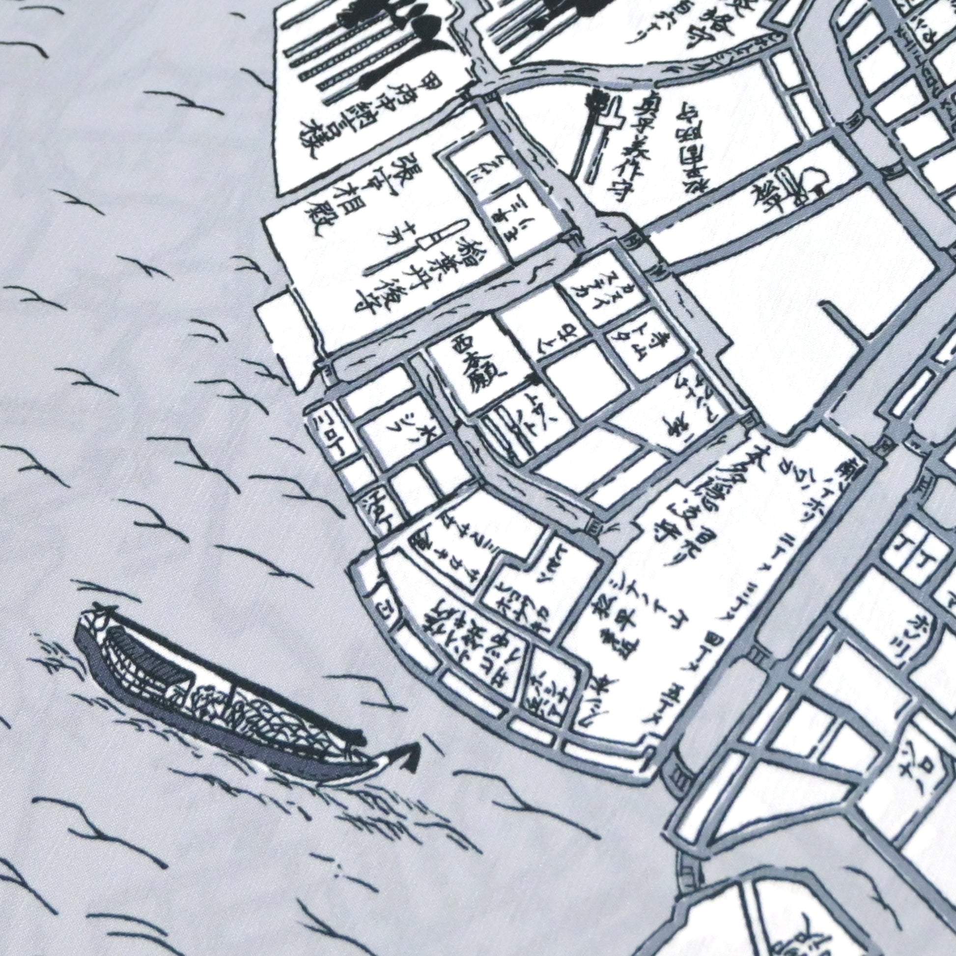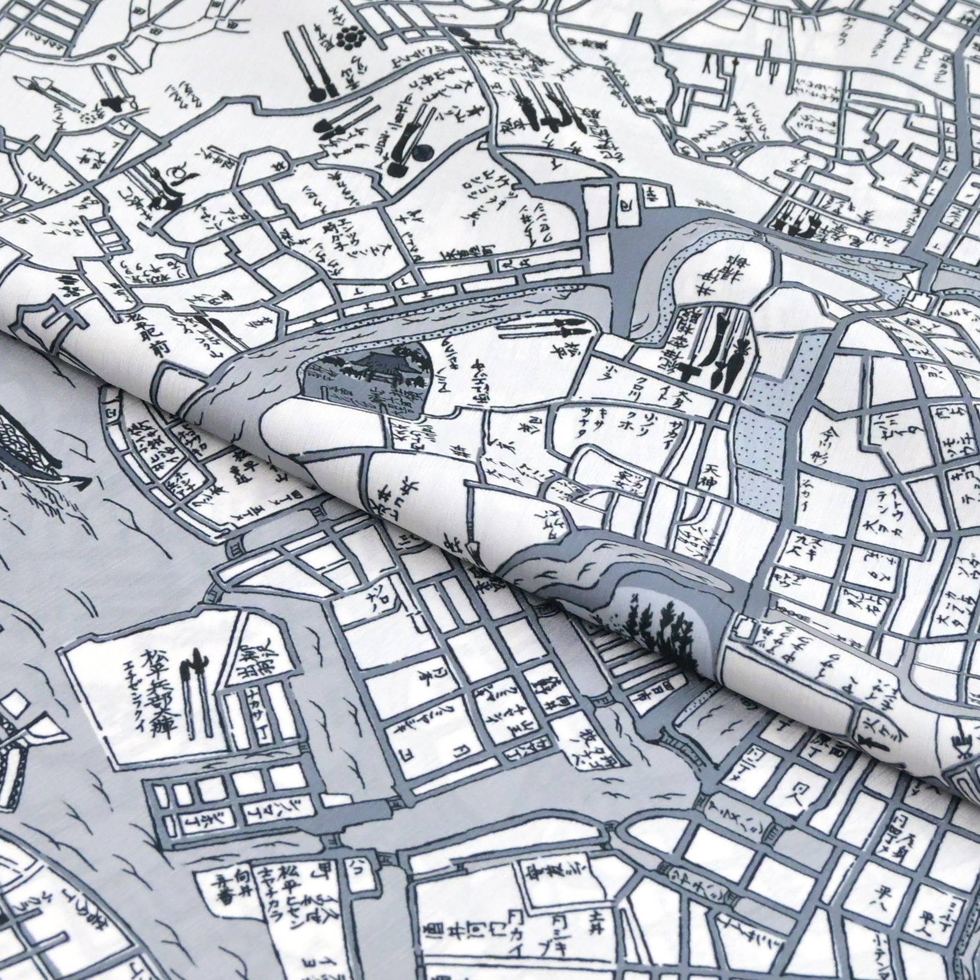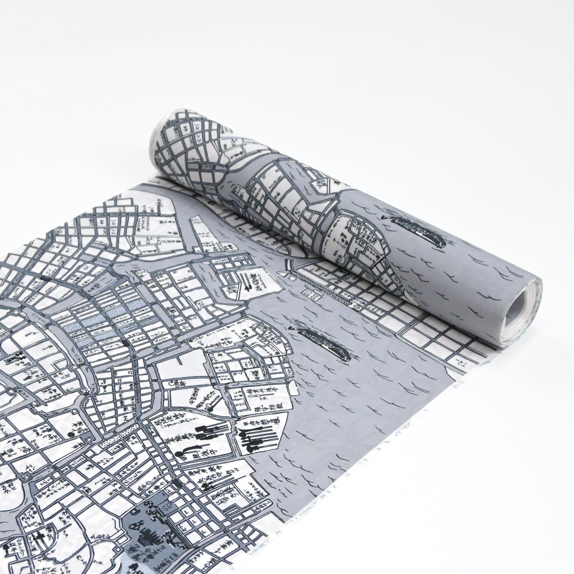 古地図をモチーフにデザインされたユニークな長襦袢。袖や衿からチラリと見えたときのインパクトが楽しみになる遊び心あふれるデザインは、カジュアル着物と合わせて、普段使いできる気軽さがあります。