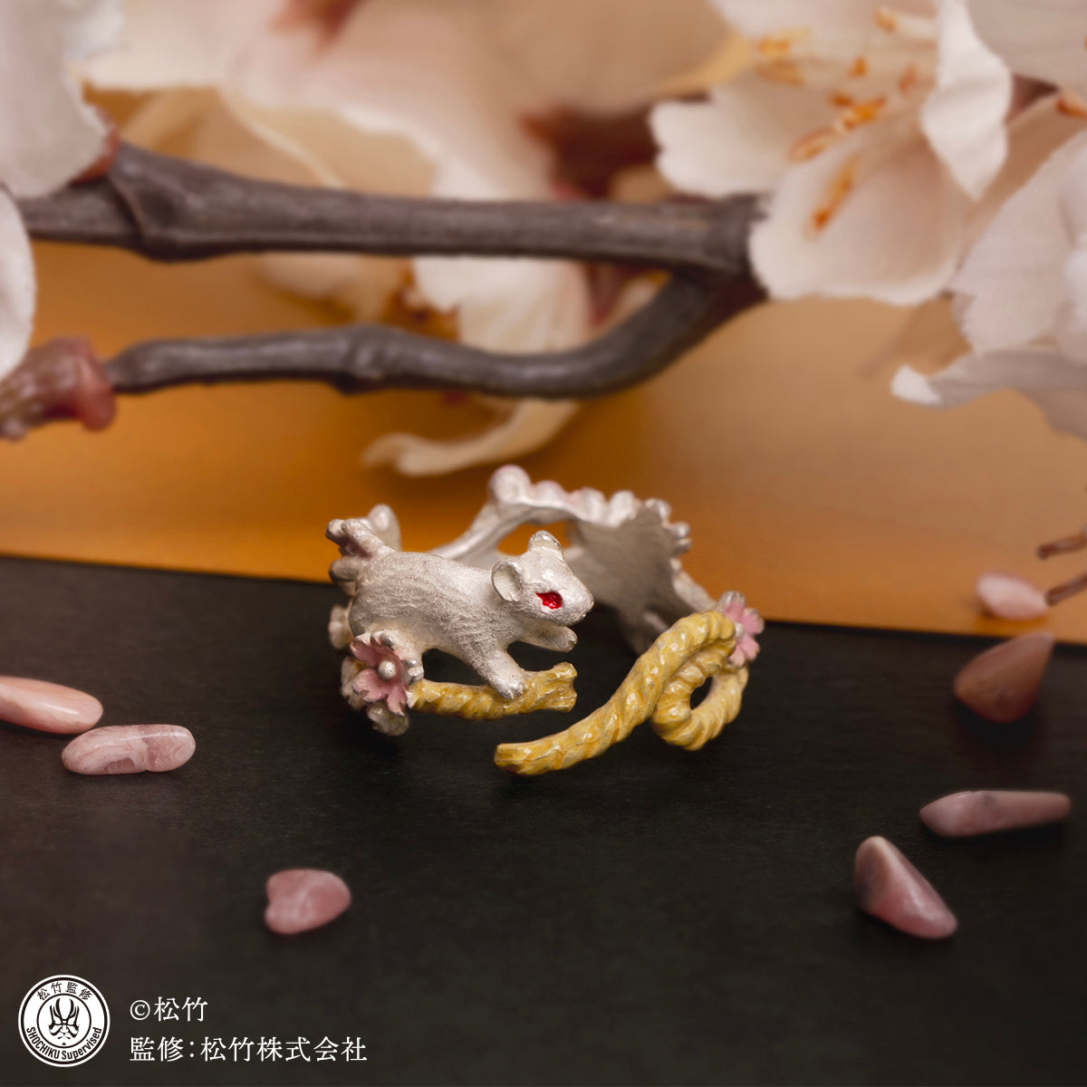 このリングは、縄でつながれた雪姫が桜の花びらを使い、爪先で描いた鼠が動き出し、縄を食いちぎって自由の身になる場面から着想を得てデザインしました。