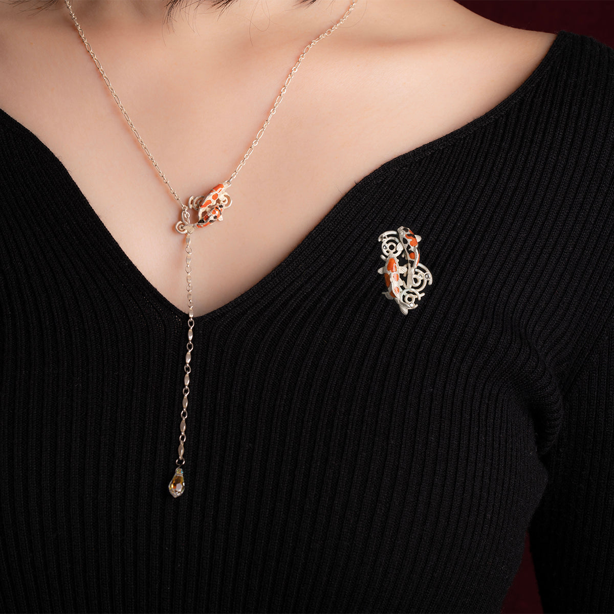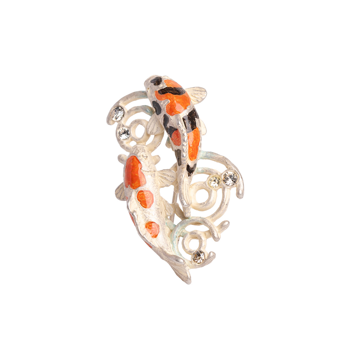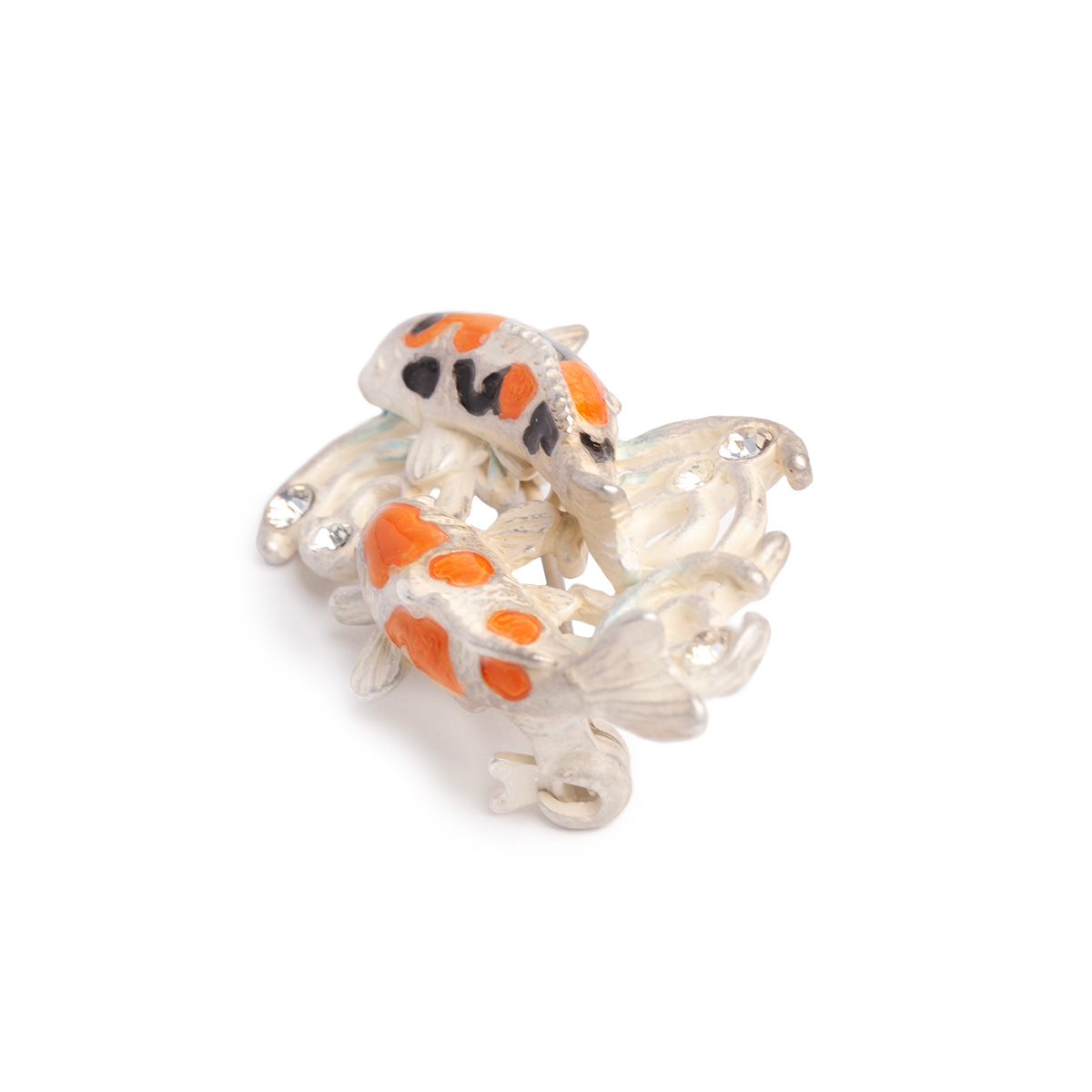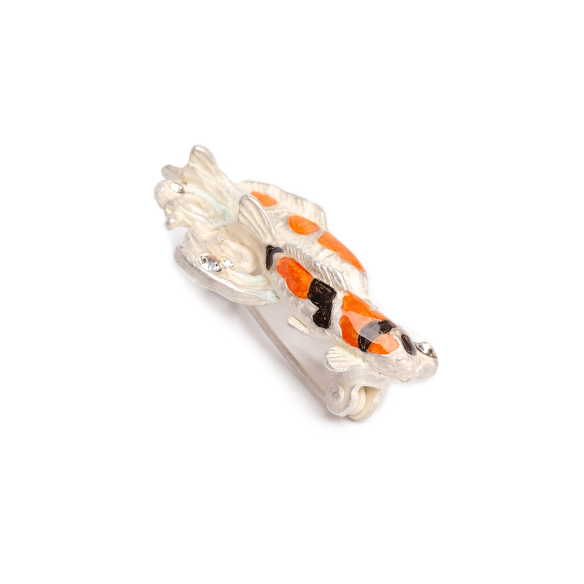 立体的な造形が美しい錦鯉と、静かにゆらめく水面を文様のような水紋で表現した、魅力的なアクセサリーです。