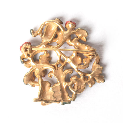 複雑に絡み合う蔦の様子が優雅で美しいブローチは、中世の装飾写本を彩った飾りがモチーフになっています。青い花や赤い花が咲く不思議な植物は動物たちの憩いの場。リスやカラスやウサギなどの動物たちが花や蔦の間から顔をのぞかせます。