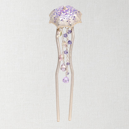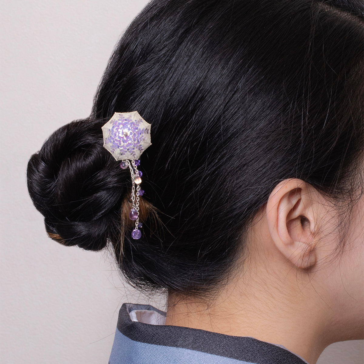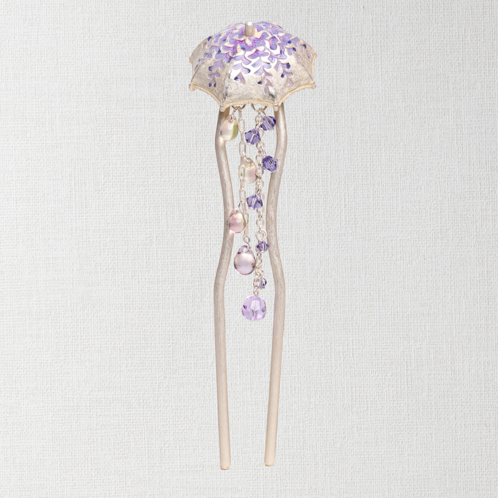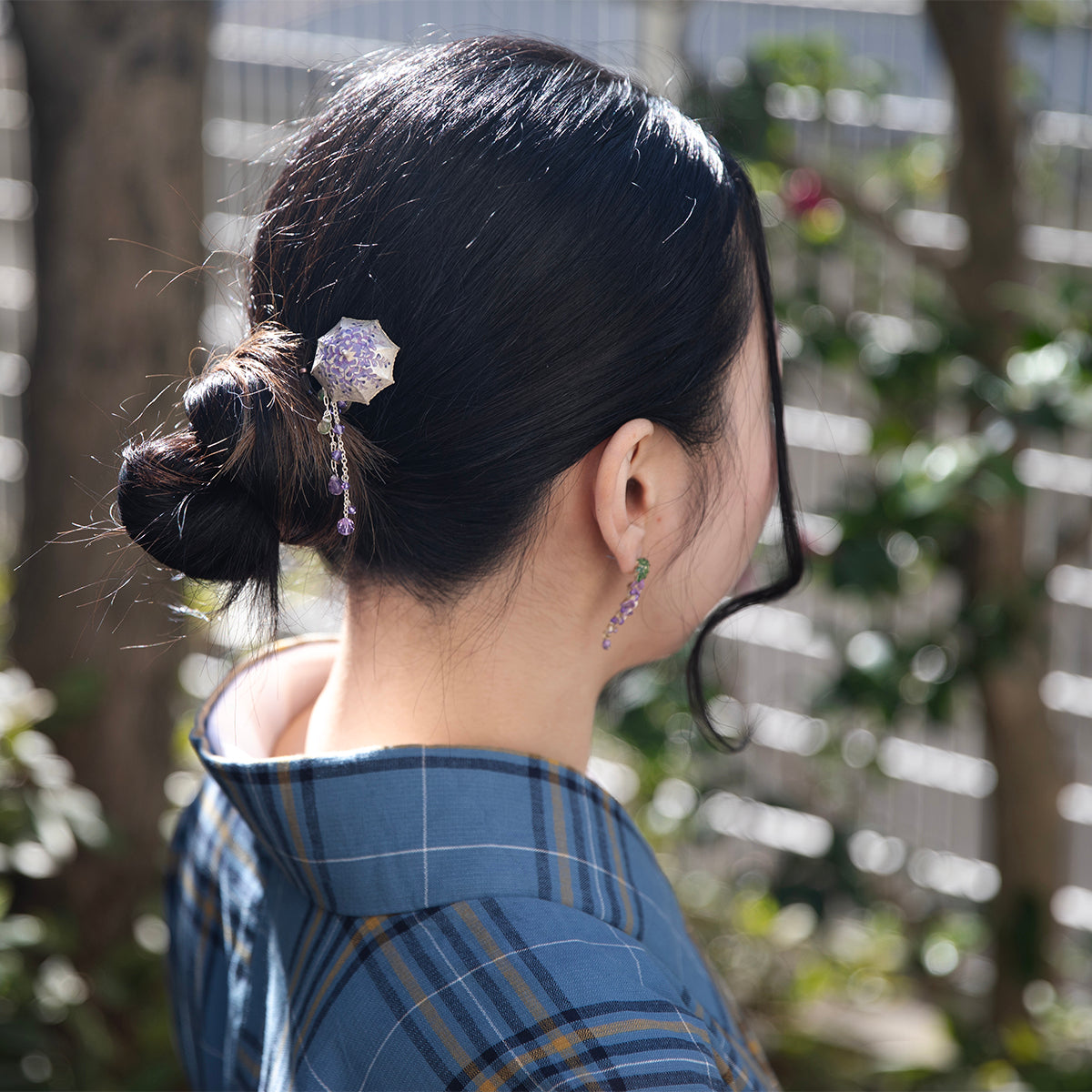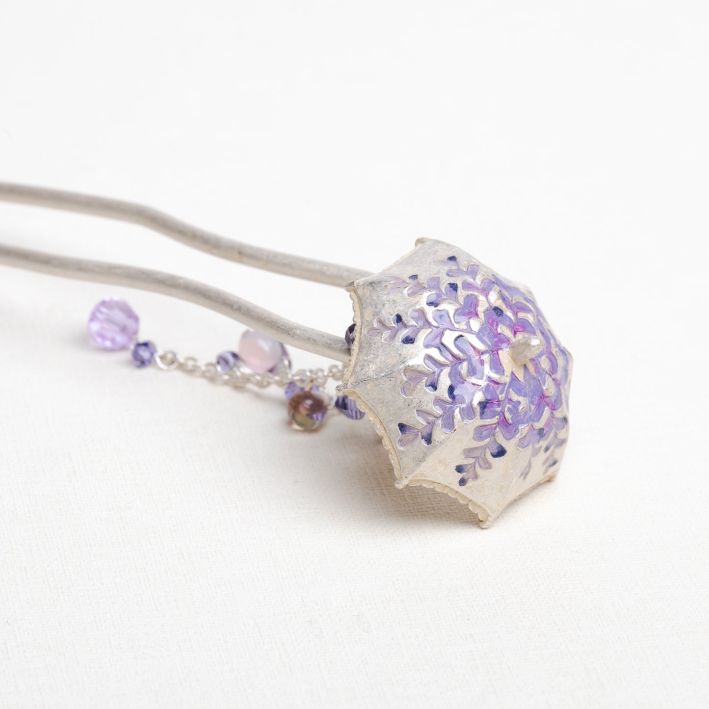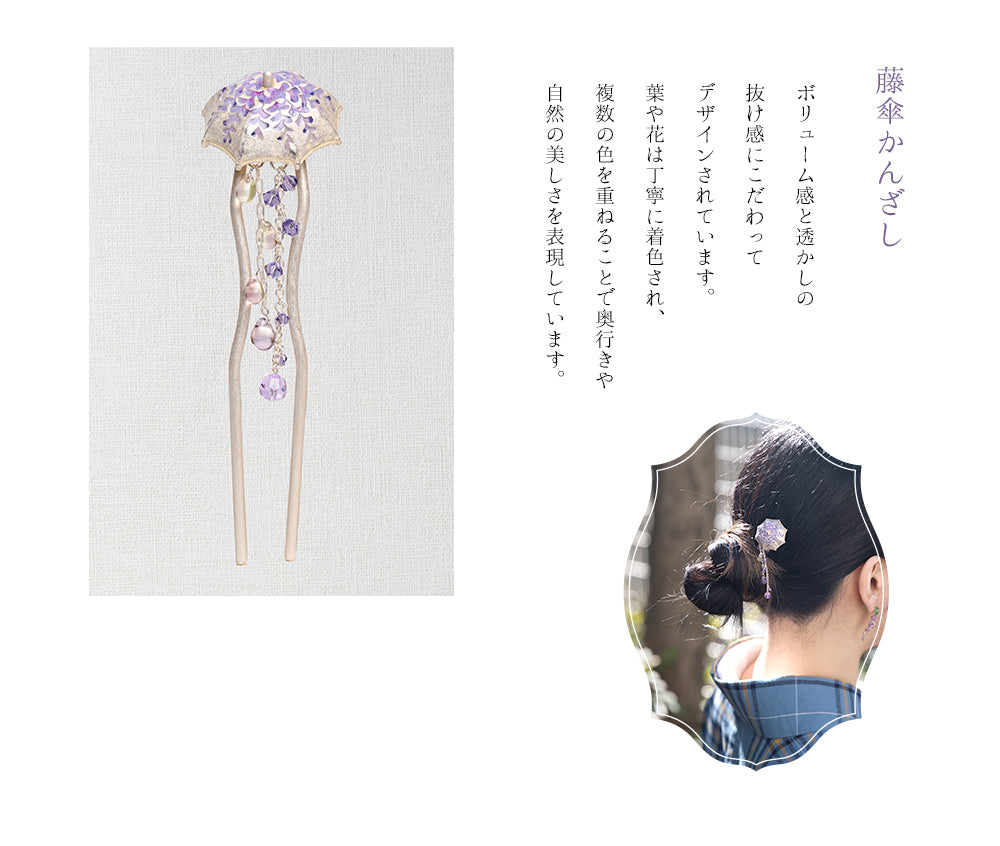 藤の花があしらわれた傘をモチーフにしたかんざし。傘の模様は複数の色を重ねることで、零れ落ちるようたおやかに咲く藤の花を表現しました。傘の下にあしらわれたビーズは雨粒をイメージし、藤の花の色を受けてほんのり淡く色づいています。