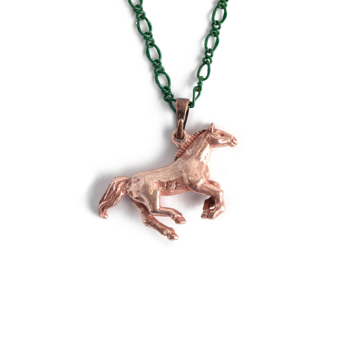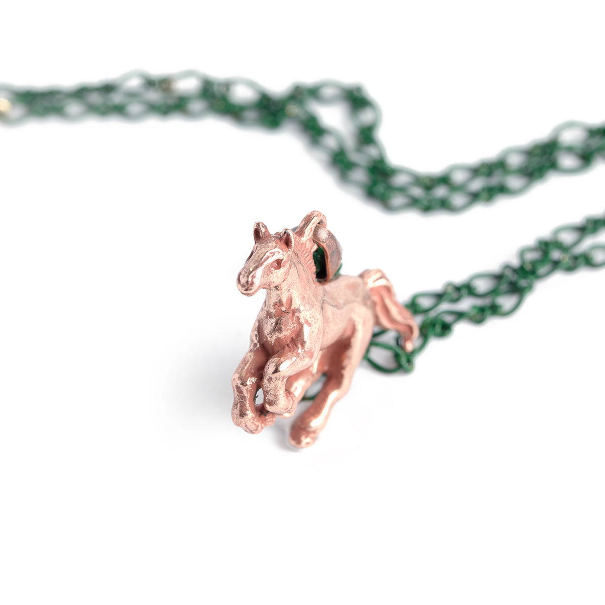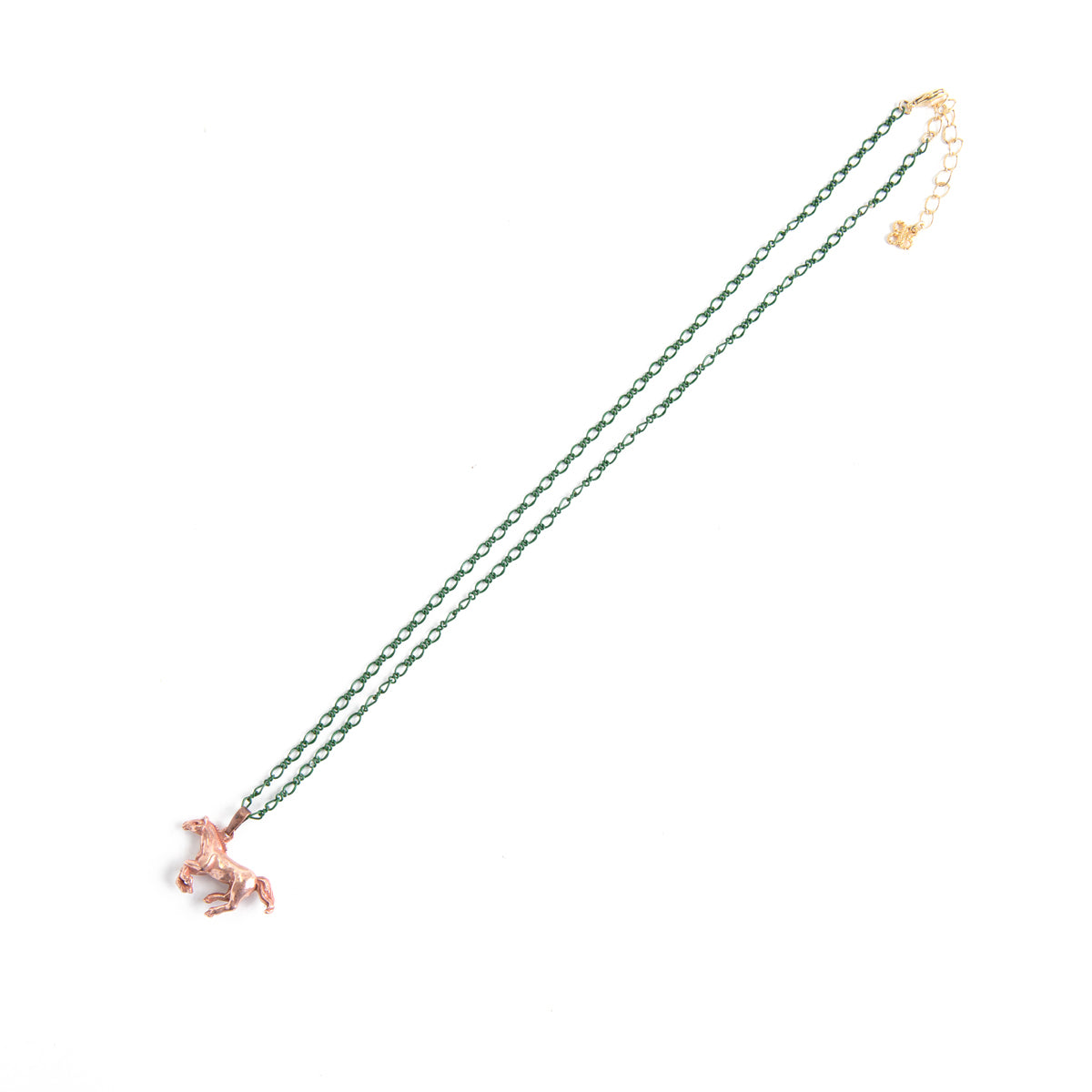 尻尾をなびかせ優雅に駆ける馬をモチーフにしたネックレス。躍動感を再現するため、着用時に馬の体が斜めになるよう調整されています。アンティーク感のあるピンクのモチーフとグリーンのチェーンを組み合わせてクラシカルな雰囲気に仕上げました。