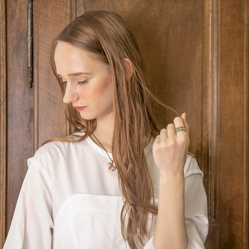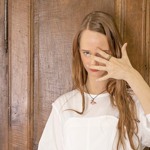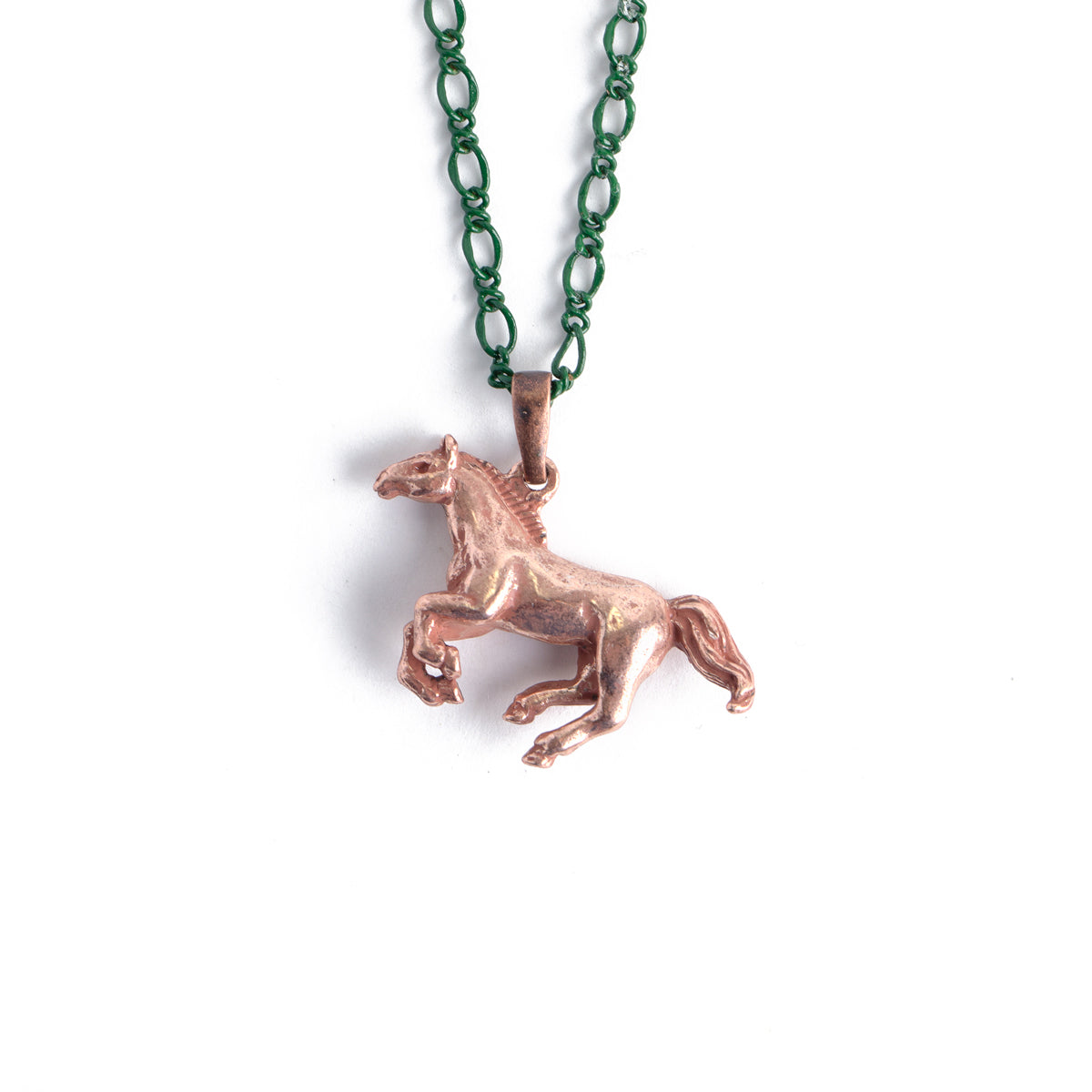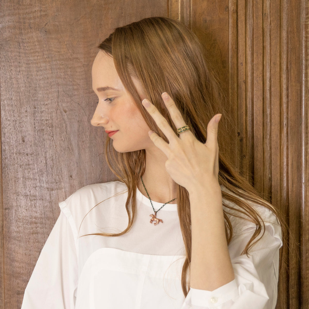 尻尾をなびかせ優雅に駆ける馬をモチーフにしたネックレス。躍動感を再現するため、着用時に馬の体が斜めになるよう調整されています。アンティーク感のあるピンクのモチーフとグリーンのチェーンを組み合わせてクラシカルな雰囲気に仕上げました。