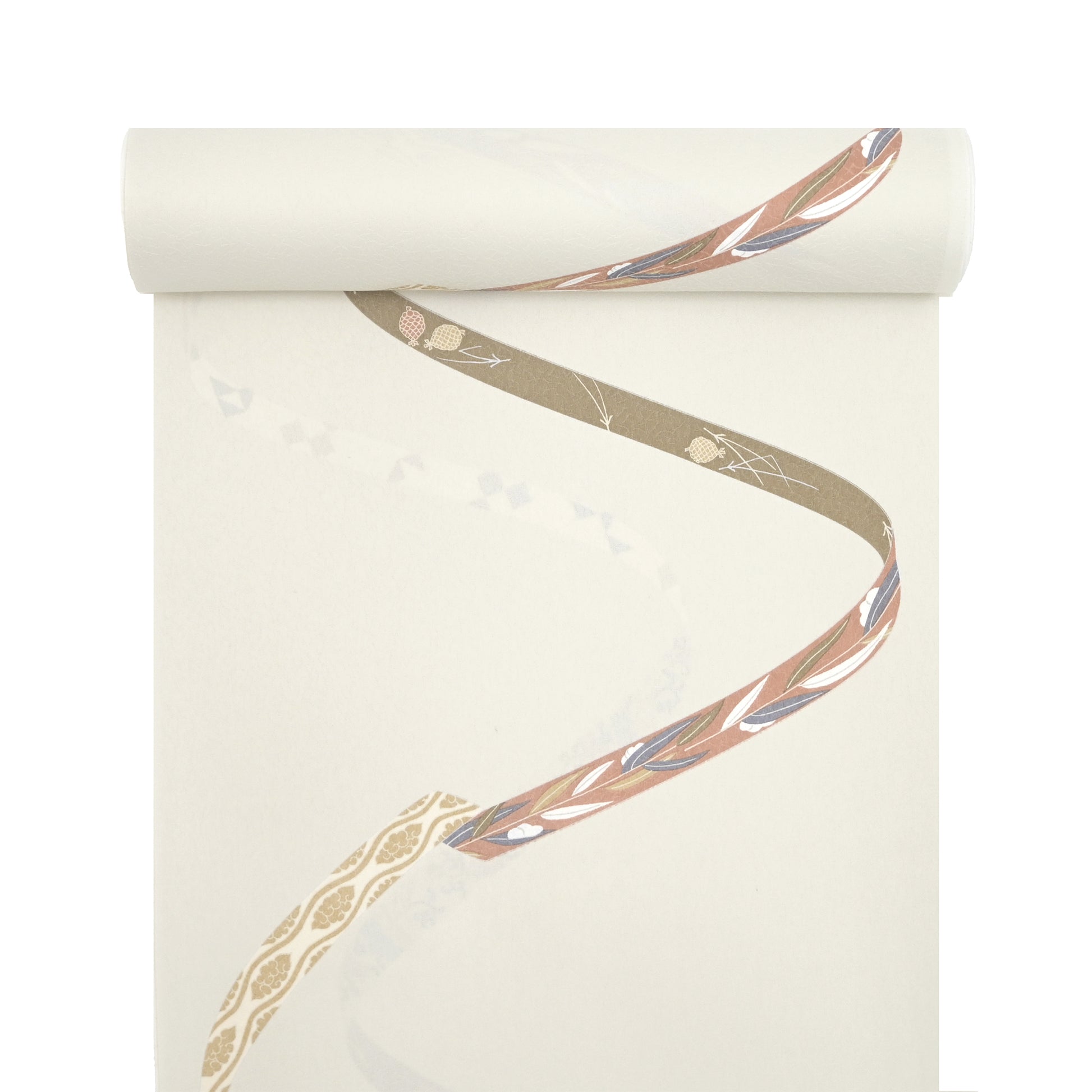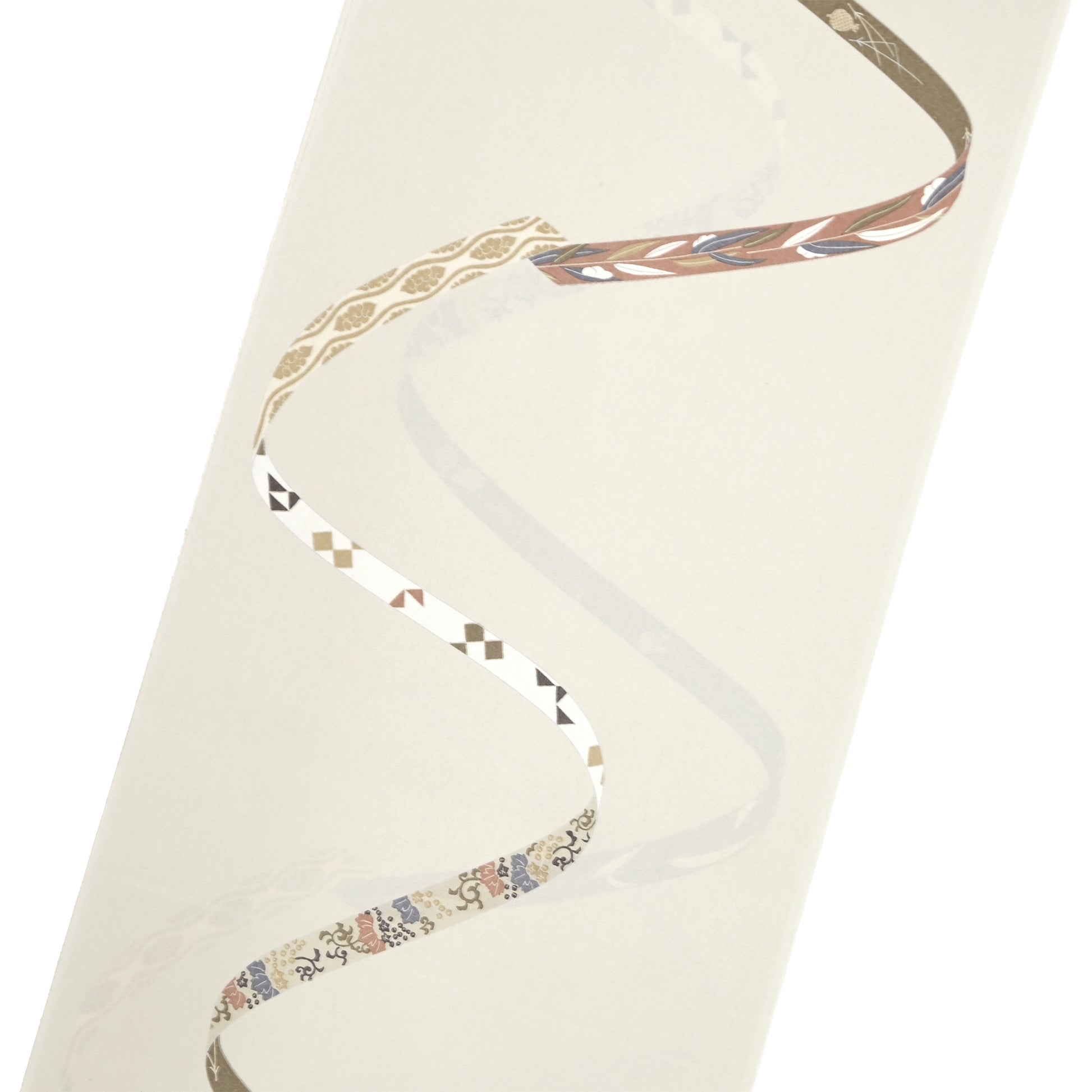 能装束の衣裳の一部「鬘帯(かずらおび)」をモチーフにした伝統的なデザインが、無地場を活かした上品な構図で表現されています。
