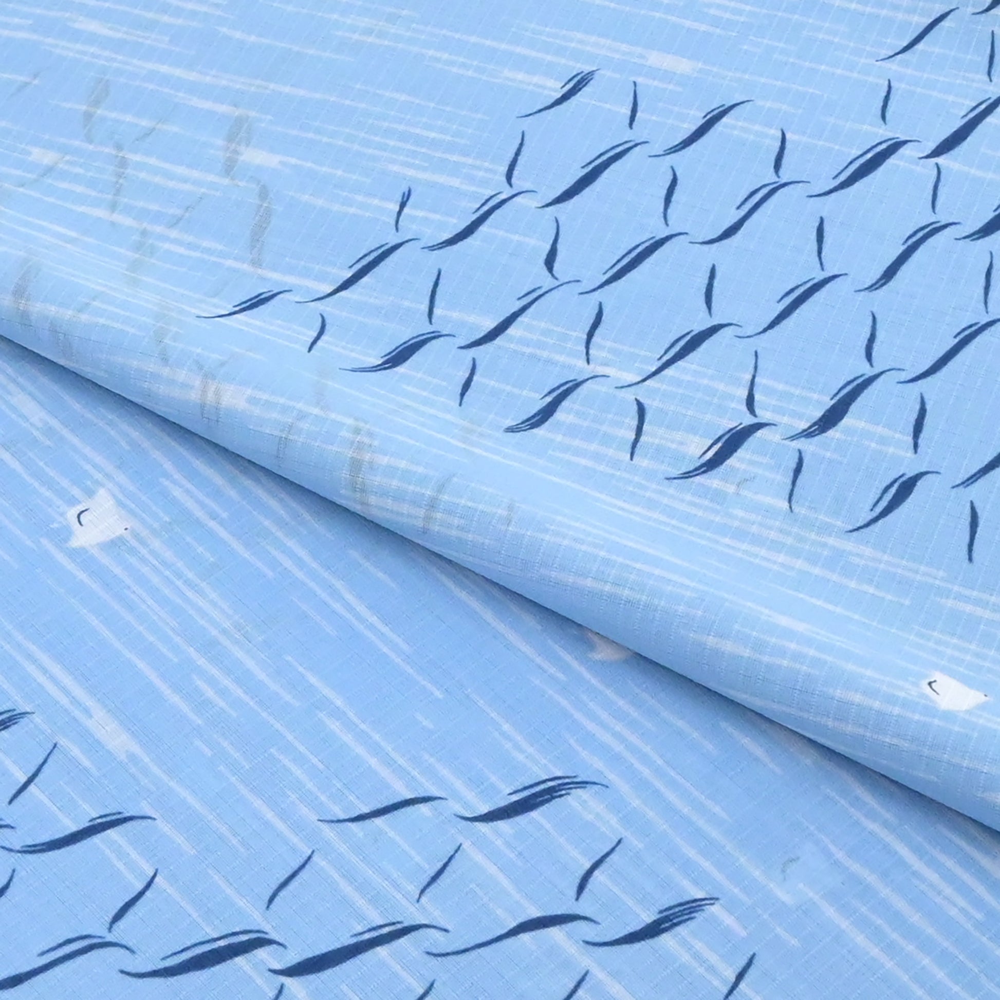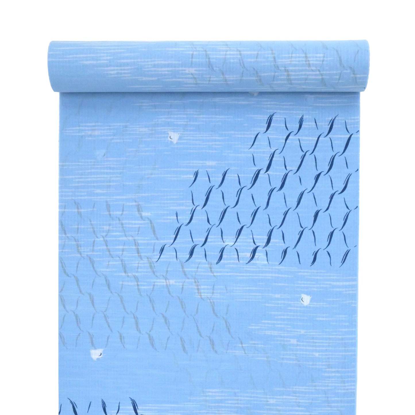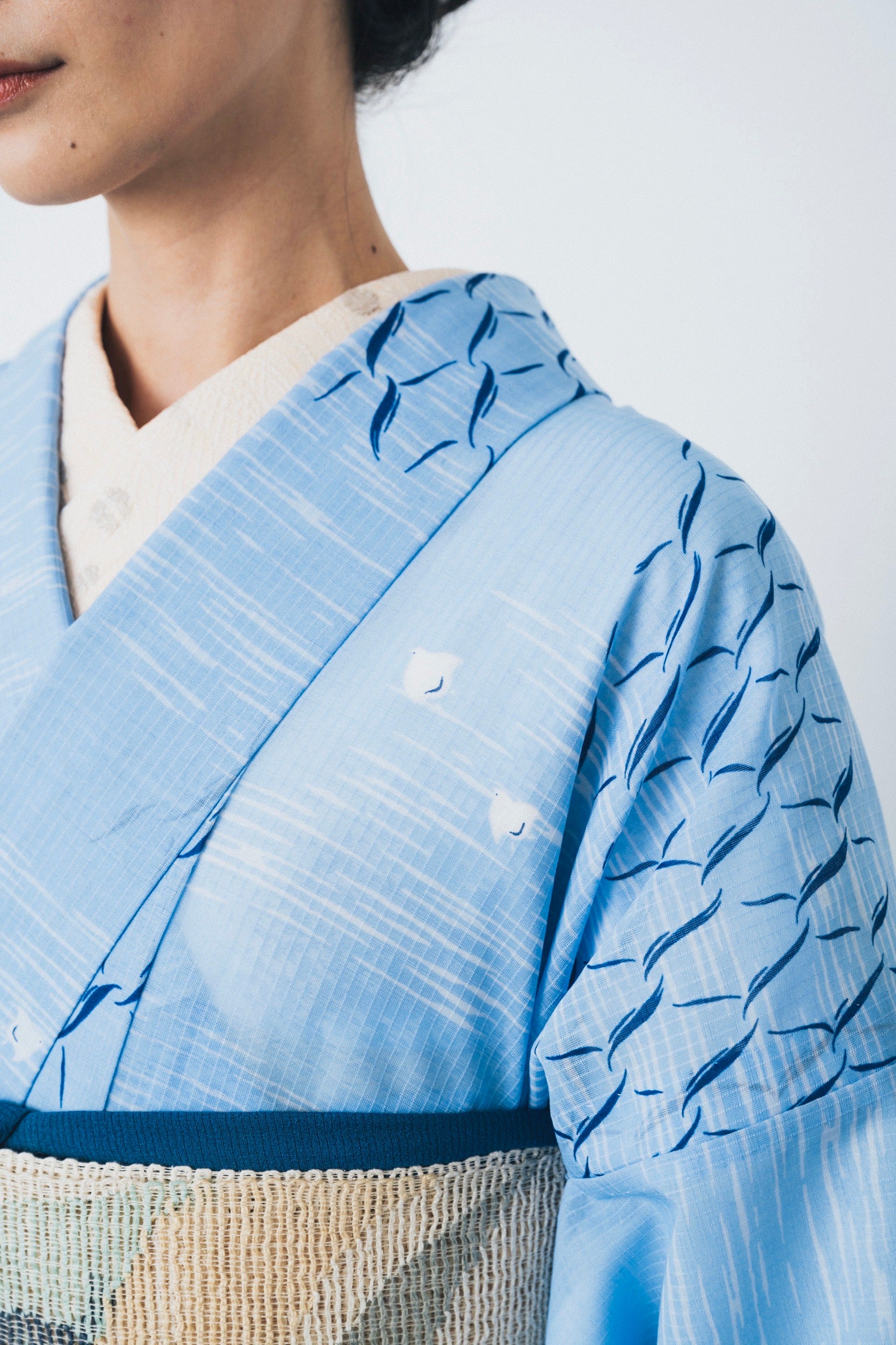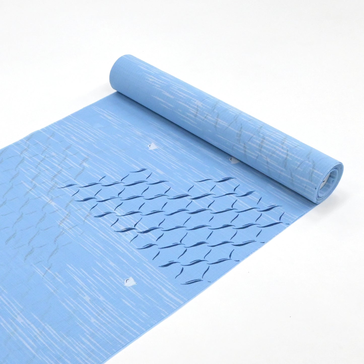 寄せては返す長閑な波。あちらへこちらへと思い思いに飛び立つ水鳥たち。そんな海辺の風景にリズミカルな網目文様を重ねました。仕立て上がると、網目文様が一層印象的に浮き上がってきます。